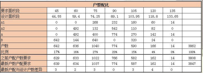 从户型分布来看,A区没有45平,其他户型分布相对均衡,B区没有90、135,集中在45、75、105。