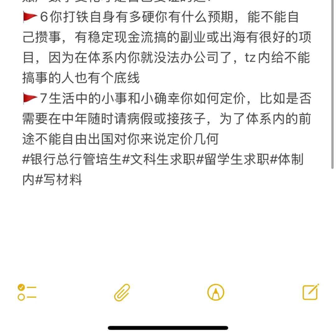 🚩6你打铁自身有多硬你有什么预期,能不能自己攒事,有稳定现金流搞的副业或出海有很好的项目,因为在体系内你就没法办公司了,tz内给不能搞事的人也有个底线