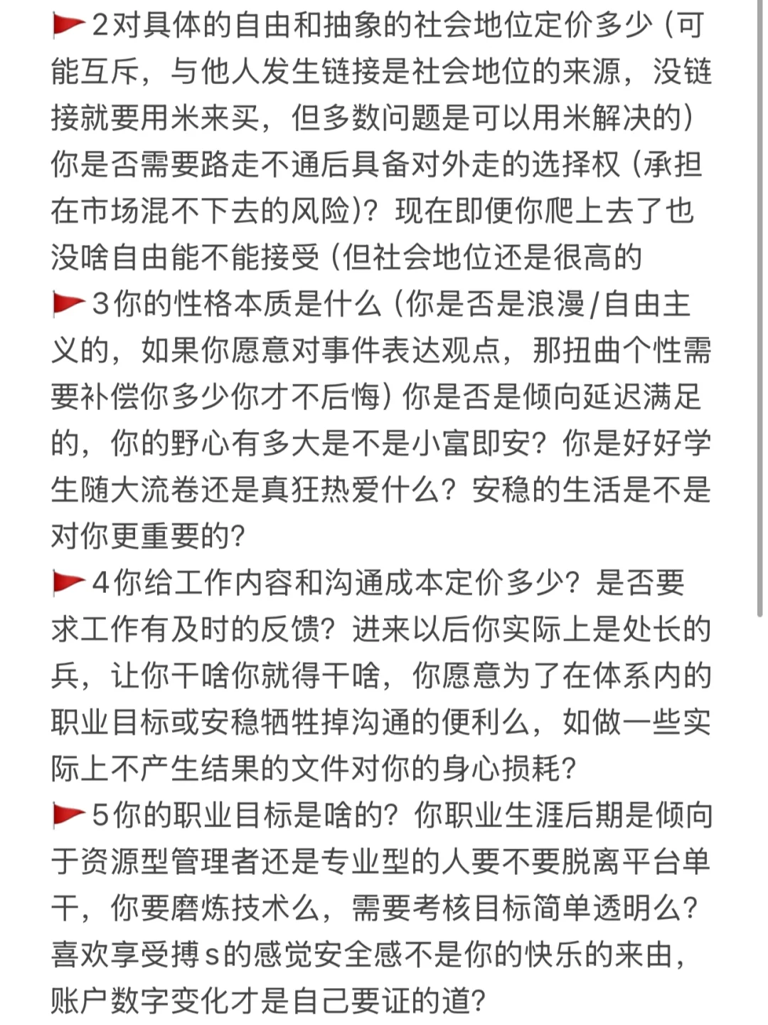 🚩4你给工作内容和沟通成本定价多少?是否要求工作有及时的反馈?进来以后你实际上是处长的兵,让你干啥你就得干啥,你愿意为了在体系内的职业目标或安稳牺牲掉沟通的便利么,如做一些实际上不产生结果的文件对你的身心损耗?