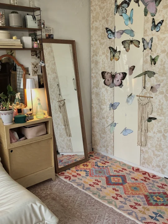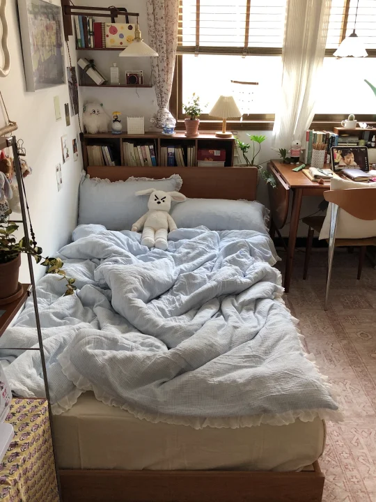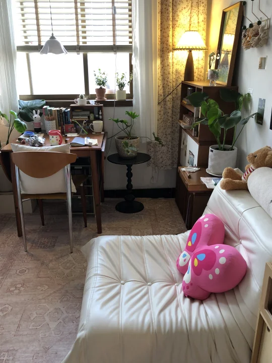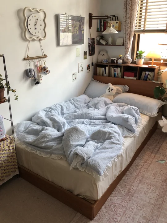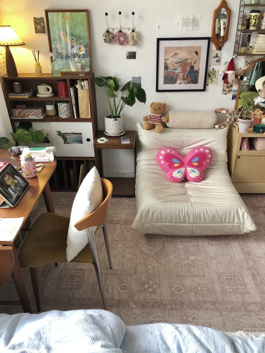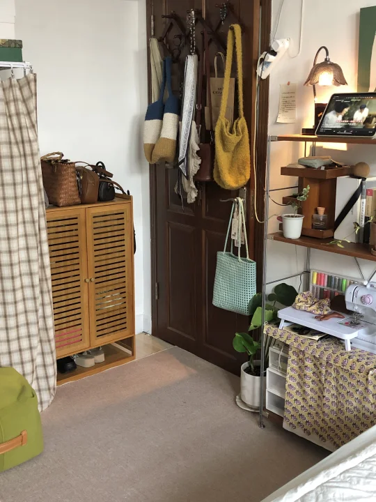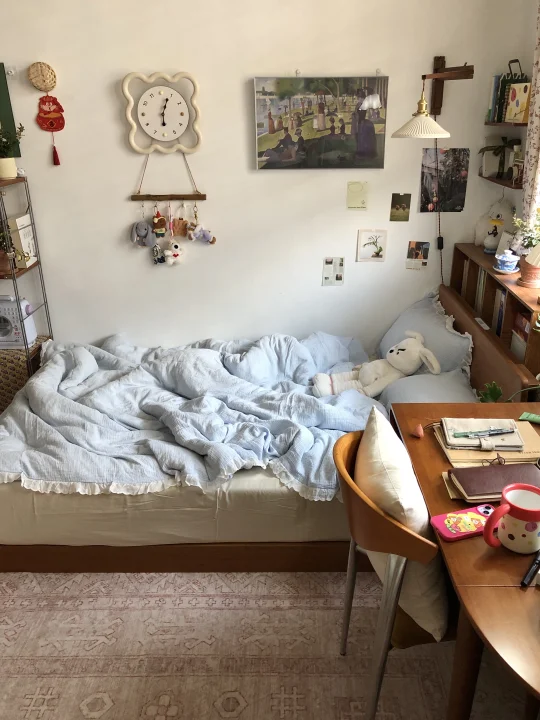 极繁主义者的卧室布置会榨干每一寸土地哈哈 最近把门后的一点空间也布置好了 12平房间每一面墙都没空着 满满当当但是不会感觉拥挤 附一张房间平面布局图供参考啦