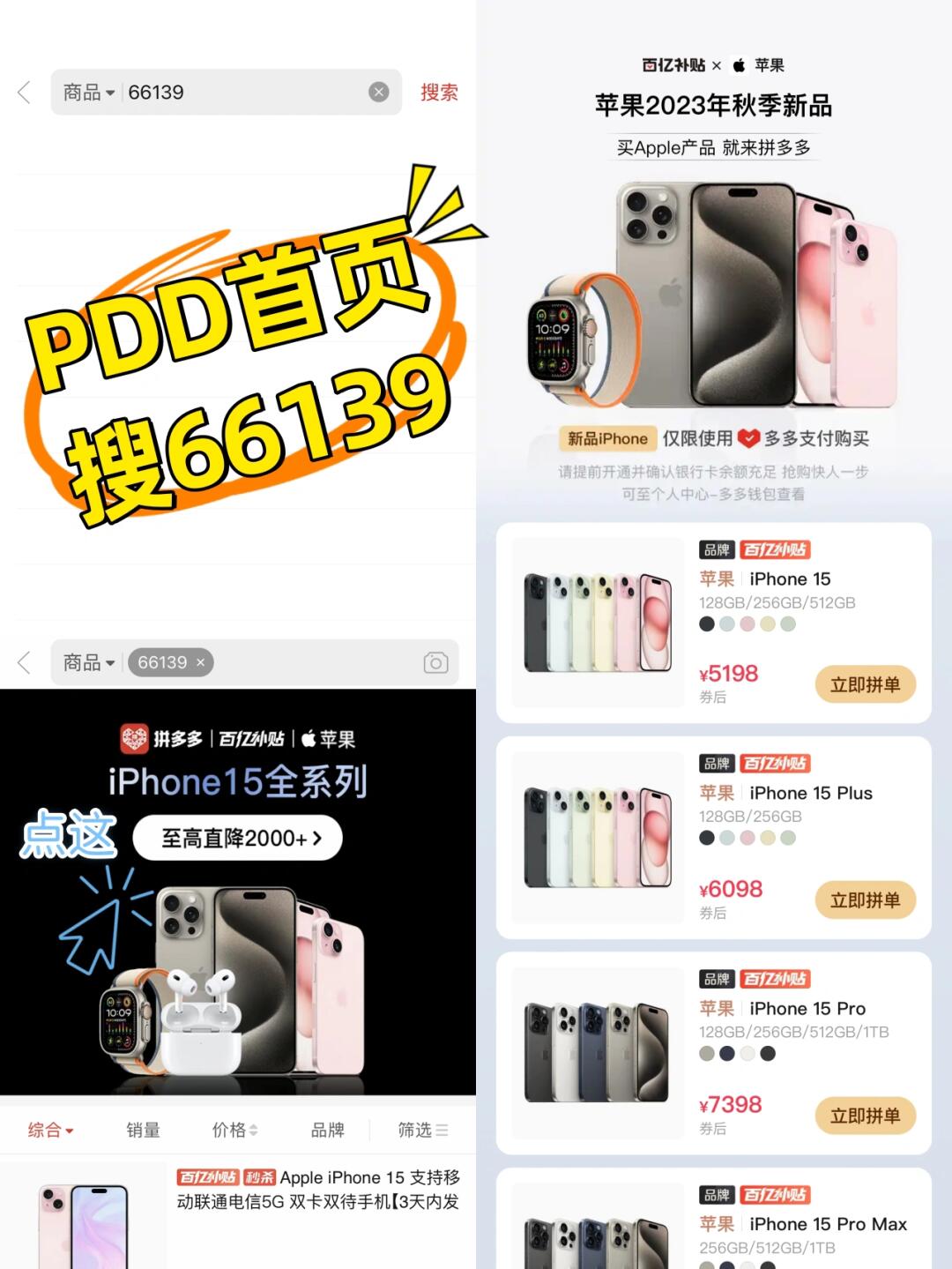 打开PDD,在首页搜索【66139】,会看到iphone15全系列至高直降的图片。