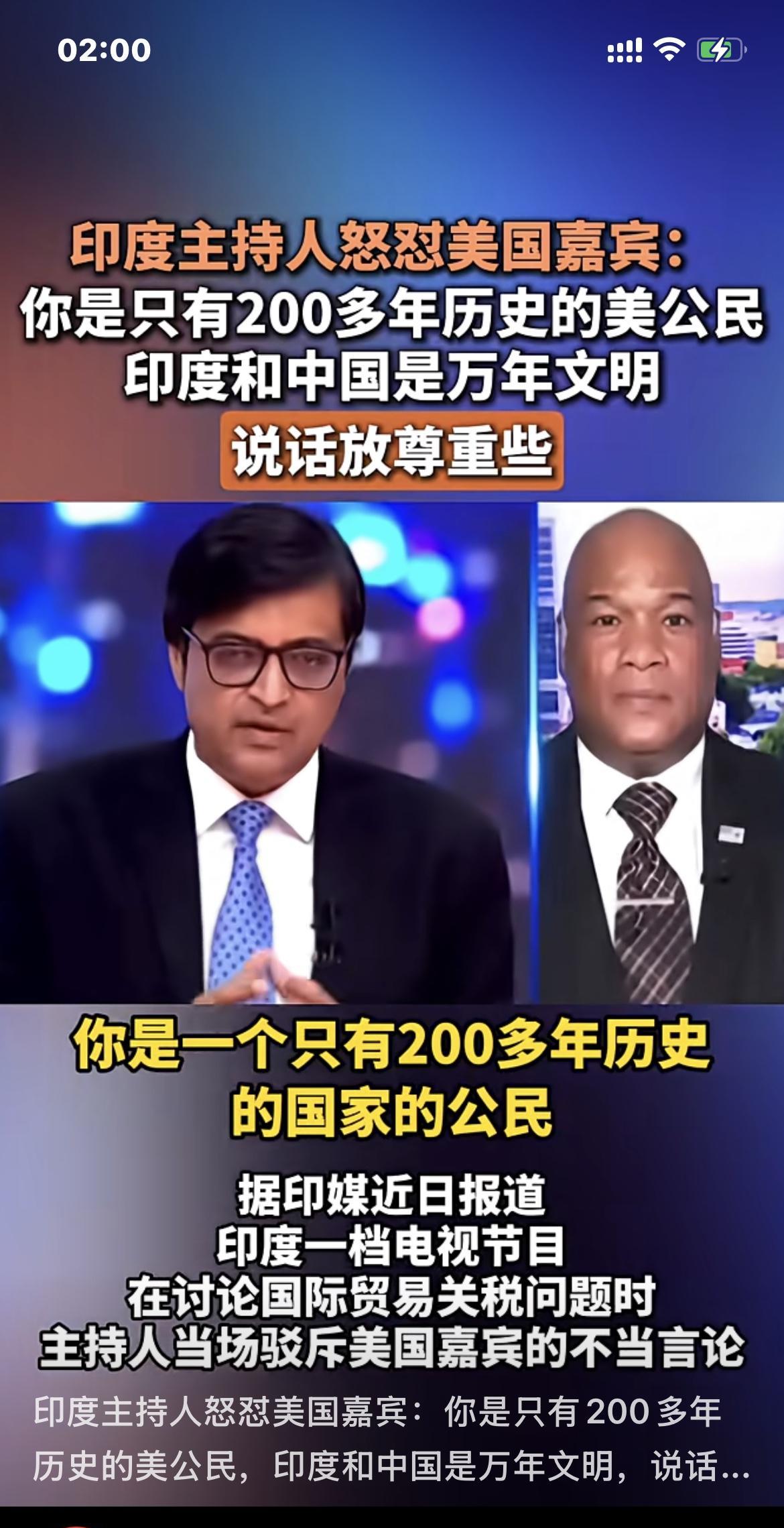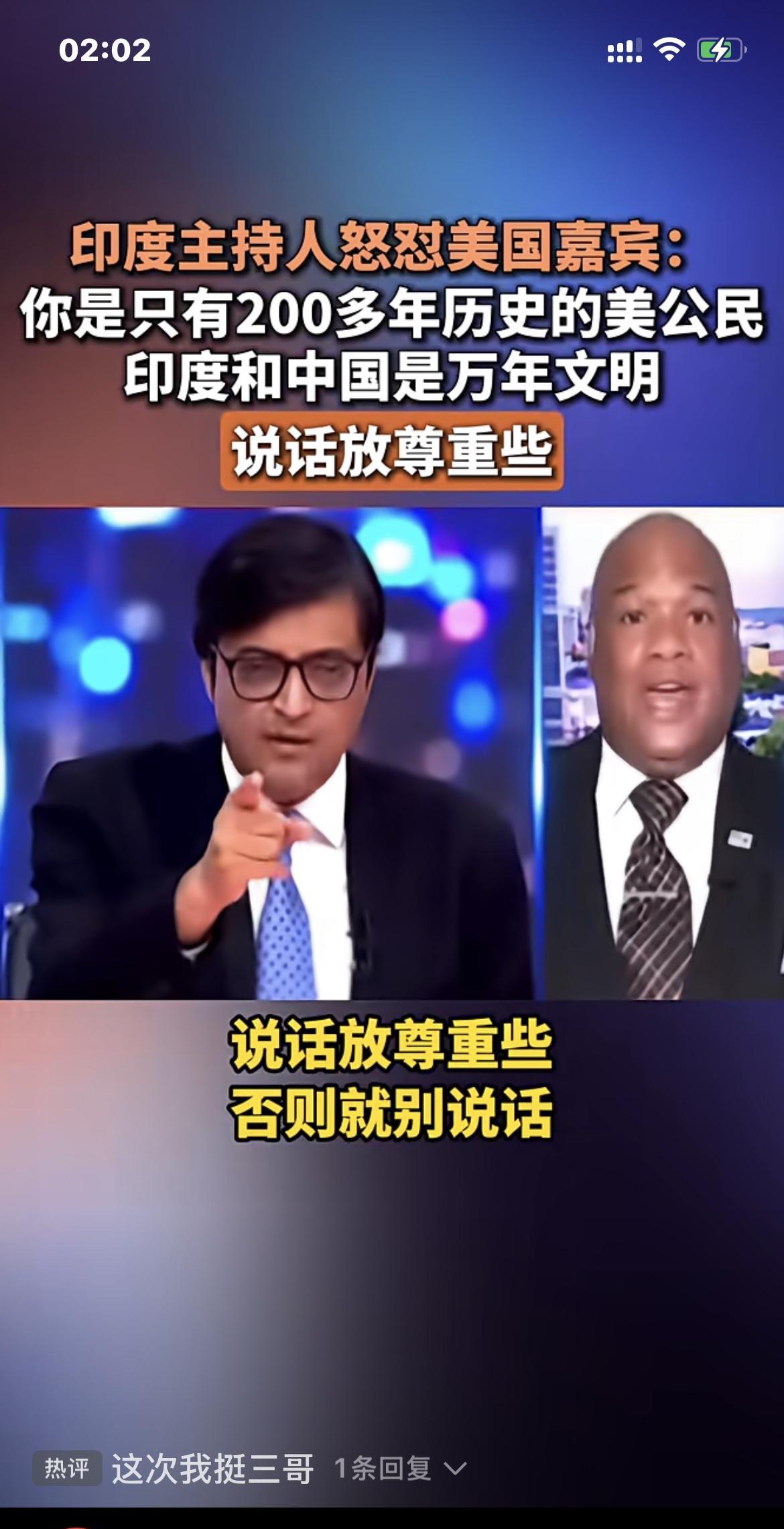 三哥气爆了,一句话噎死了美国佬 8月7日,印度右翼新闻频道主持人阿纳布,组织印度和美国关税问题的辩论,一位叫伯恩斯的美国牧师以“说教”式的口吻对印度外交举措进行“点评”,这使得阿纳布很不满意。他怒怼到,“请记住一件事情,你是一个来自200年历史的国家的公民,一个名叫美国的新国家的公民,而印度和中国是有1万年历史的文明,请保持尊重地交谈,否则就别说”。 还真服了三句哥!什么牛都敢吹,什么话都敢说,不过这次吹的可是真的,骂的也是实的,对美国佬就应这样!