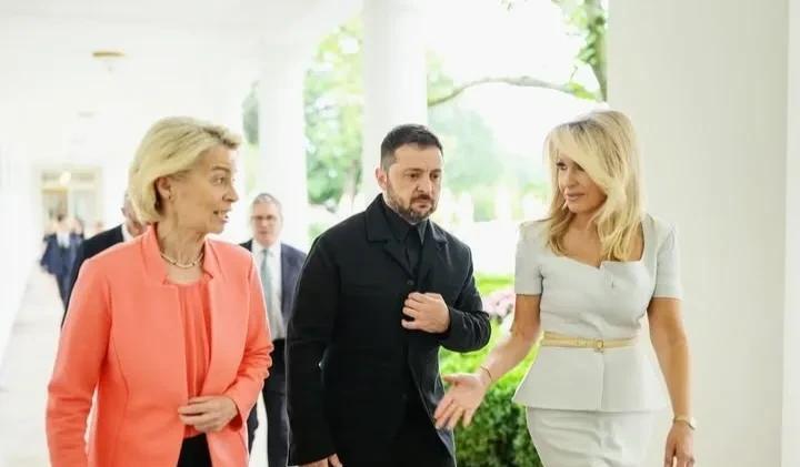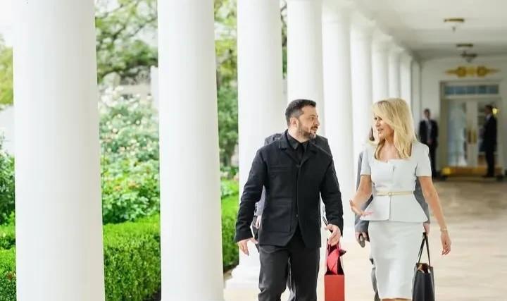 57岁的美国礼宾司司长莫妮卡·克劳利分享与泽连斯基的照片,两人在白宫走廊热情交谈