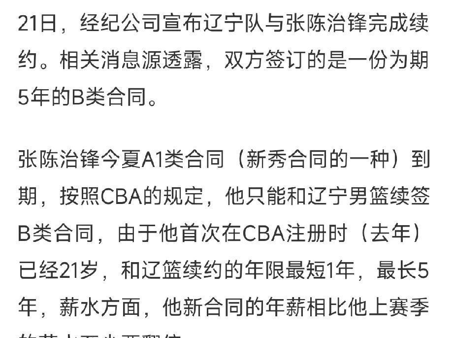 辽宁男篮又一中锋续约,应该多给上场机会! 近日,辽宁男篮完成了和张陈治锋的续约,据悉合同为B类5年!新赛季的合同薪资比上赛季之前翻倍,对于张陈治锋来说,也算是慢慢走上正轨了! 但是,辽宁男篮应该多给张陈治锋机会,新秀赛季治锋基本没打。新赛季我感觉他的机会会多些,毕竟大韩退役内线缺人,张陈治锋的身体还是可以的,只是脚步有点碎,对抗差一点,但是只要给机会多练练,还是可以的!