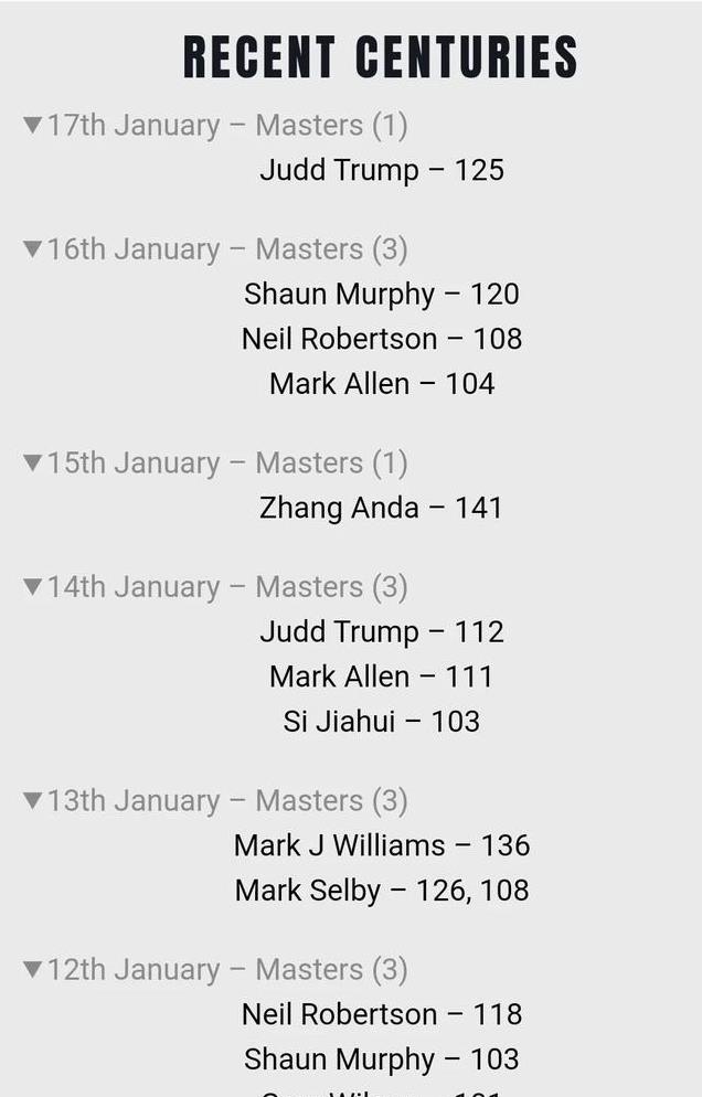 这个比赛日两场比赛,仅小特打出一杆破百,特鲁姆普生涯破百总杆数来到1029杆,悄悄地追赶着与火老头奥沙利文之间的差距。