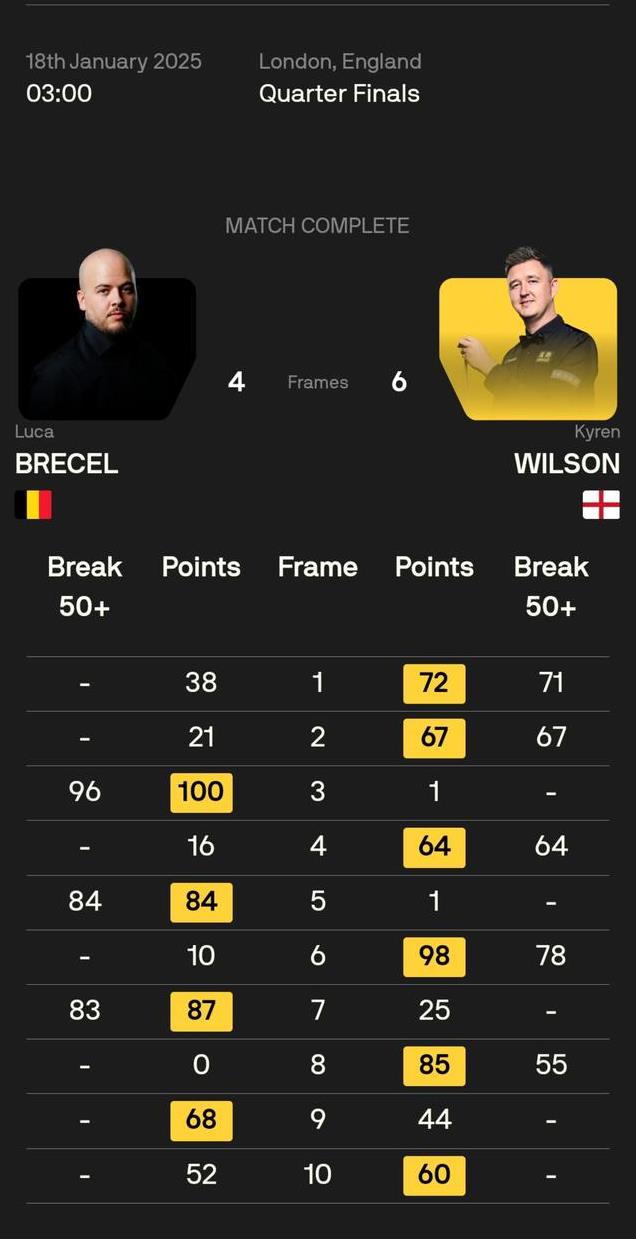 全场比赛凯伦·威尔逊打出71、67、64、78、55分五杆单杆50+,卢卡·布雷切尔打出96、84、83分的三杆单杆80+,最后两局双方都没打出单杆致胜。