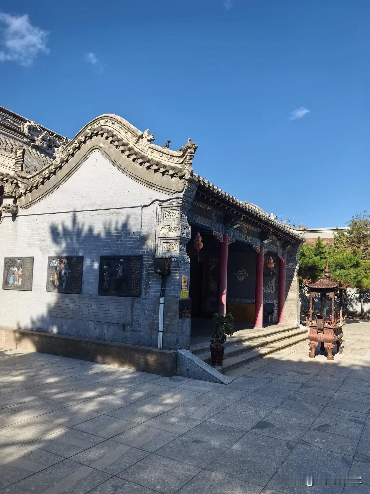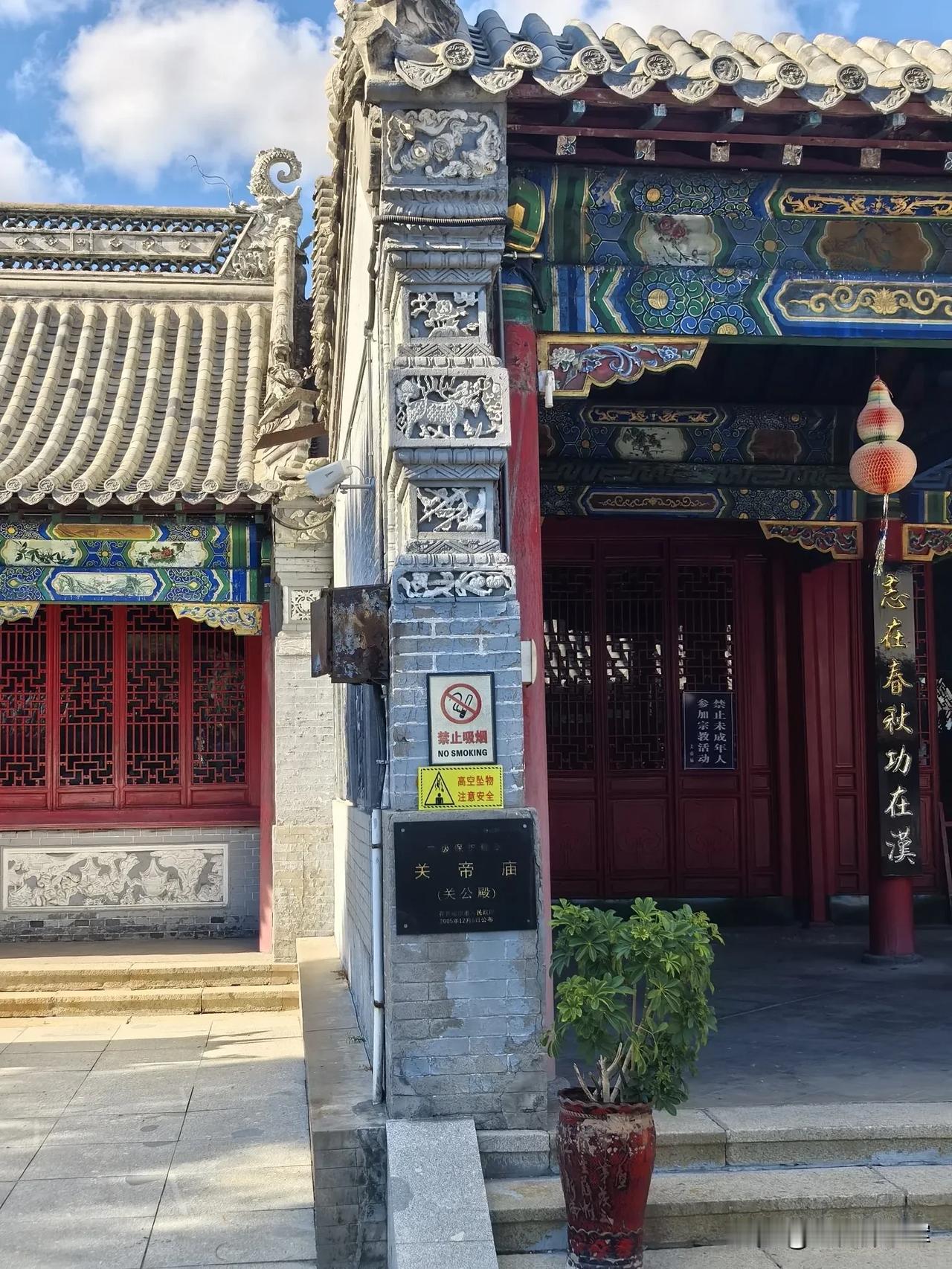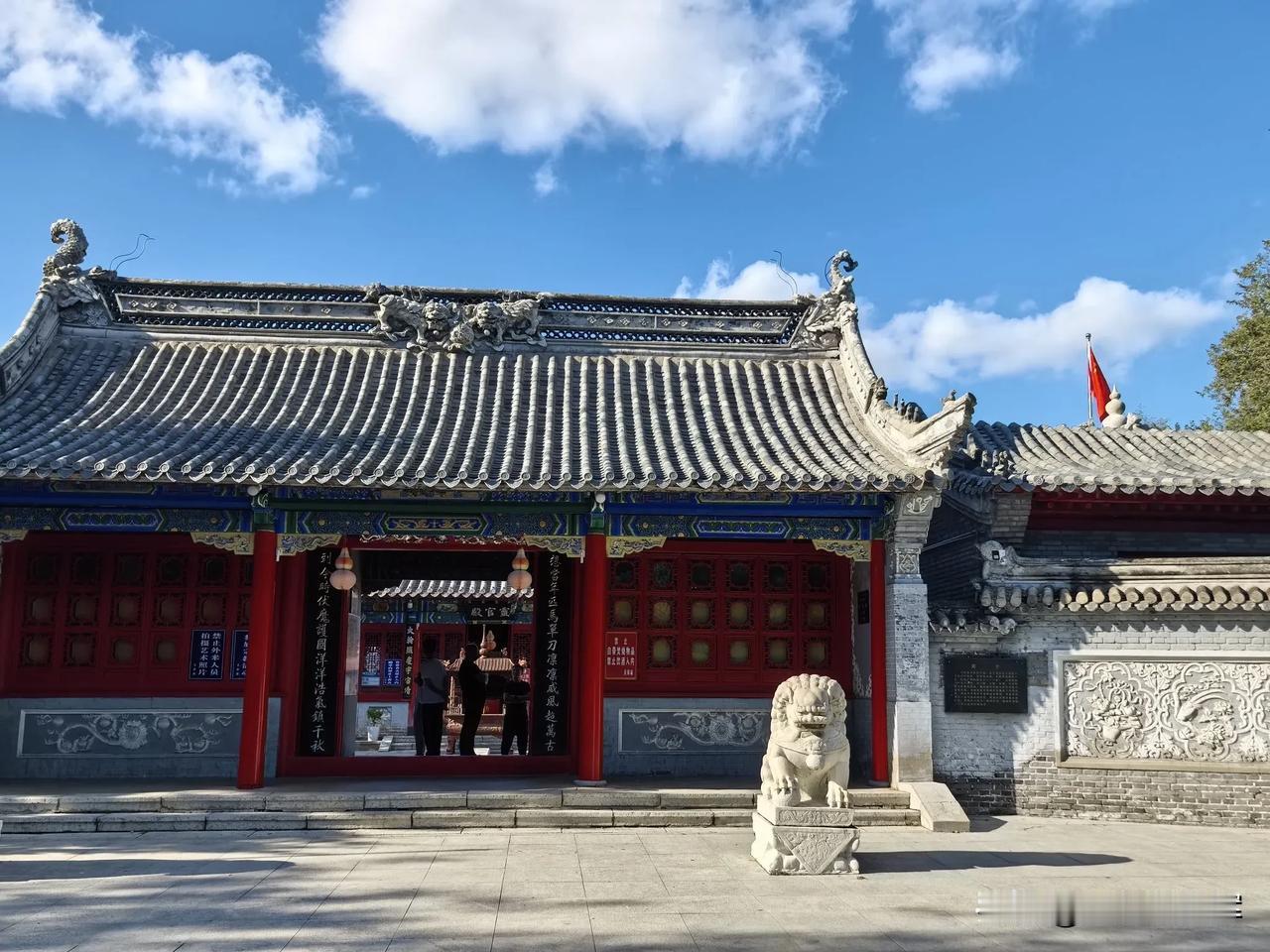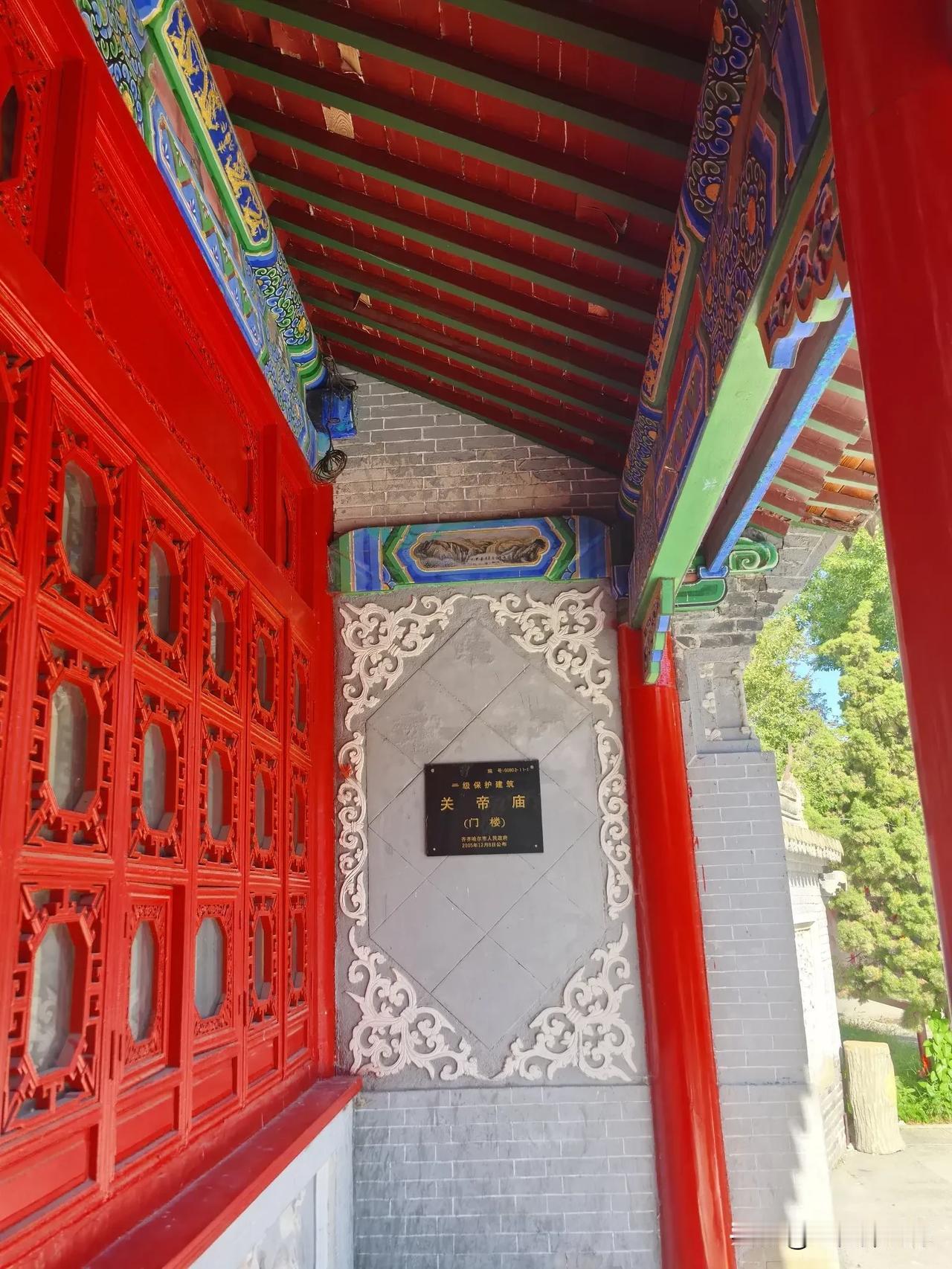 齐齐哈尔龙沙公园内的关帝庙超有韵味。它建于清乾隆四年,占地1200平方米,是市级保护单位。 走进关帝庙,传统砖木结构建筑映入眼帘。正殿高10米,三铺顶,正脊二龙戏珠,山墙石雕精美。殿内关羽像居中高2米,旁有周仓、关平,墙上重彩壁画绘着关公故事。1984年增建的钟鼓楼高8.5米,还有带漏窗的青砖封墙。 这里前殿供王灵官,后殿奉老子。庙四周绿树环绕,紧邻劳动湖。春天时,周边迎春花开、柳绿杨青,与古色古香的建筑相互映衬,美如画卷。