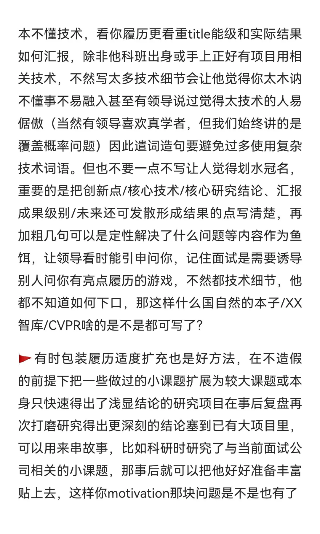 🚩但一定注意不要拘泥于技术细节。很多领导根本不懂技术,看你履历更看重title能级和实际结果如何汇报,除非他科班出身或手上正好有项目用相关技术,不然写太多技术细节会让他觉得你太木讷不懂事不易融入甚至有领导说过觉得太技术的人易倨傲(当然有领导喜欢真学者,但我们始终讲的是覆盖概率问题)因此遣词造句要避免过多使用复杂技术词语。但也不要一点不写让人觉得划水冠名,重要的是把创新点/核心技术/核心研究结论、汇报成果级别/未来还可发散形成结果的点写清楚,再加粗几句可以是定性解决了什么问题等内容作为鱼饵,让领导看时能引申问你,记住面试是需要诱导别人问你有亮点履历的游戏,不然都技术细节,他都不知道如何下口,那这样什么国自然的本子/XX智库/CVPR啥的是不是都可写了?