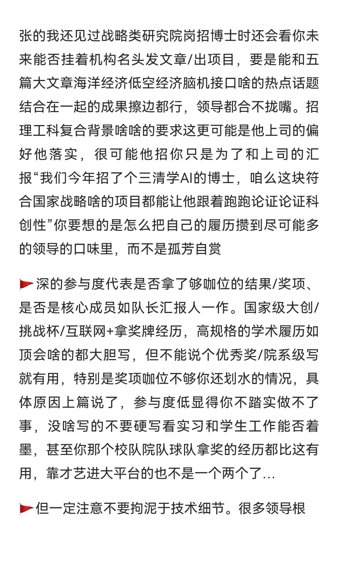 🚩领导招你是为了他自己的诉求不是你牛皮,夸张的我还见过战略类研究院岗招博士时还会看你未来能否挂着机构名头发文章/出项目,要是能和五篇大文章海洋经济低空经济脑机接口啥的热点话题结合在一起的成果擦边都行,领导都合不拢嘴。招理工科复合背景啥啥的要求这更可能是他上司的偏好他落实,很可能他招你只是为了和上司的汇报“我们今年招了个三清学AI的博士,咱么这块符合国家战略啥的项目都能让他跟着跑跑论证论证科创性”你要想的是怎么把自己的履历攒到尽可能多的领导的口味里,而不是孤芳自赏