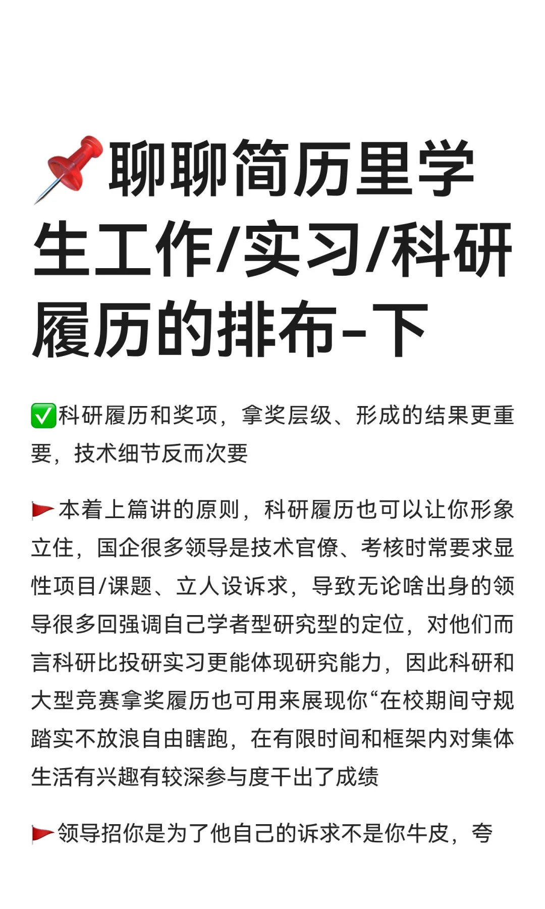 🚩深的参与度代表是否拿了够咖位的结果/奖项、是否是核心成员如队长汇报人一作。国家级大创/挑战杯/互联网+拿奖牌经历,高规格的学术履历如顶会啥的都大胆写,但不能说个优秀奖/院系级写就有用,特别是奖项咖位不够你还划水的情况,具体原因上篇说了,参与度低显得你不踏实做不了事,没啥写的不要硬写看实习和学生工作能否着墨,甚至你那个校队院队球队拿奖的经历都比这有用,靠才艺进大平台的也不是一个两个了…