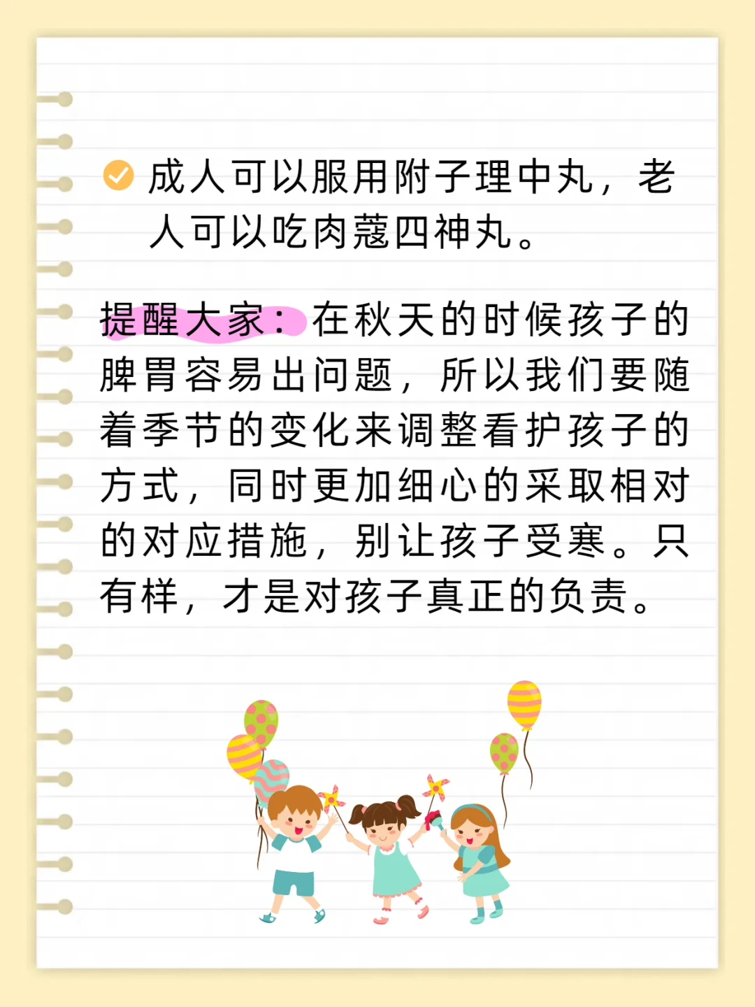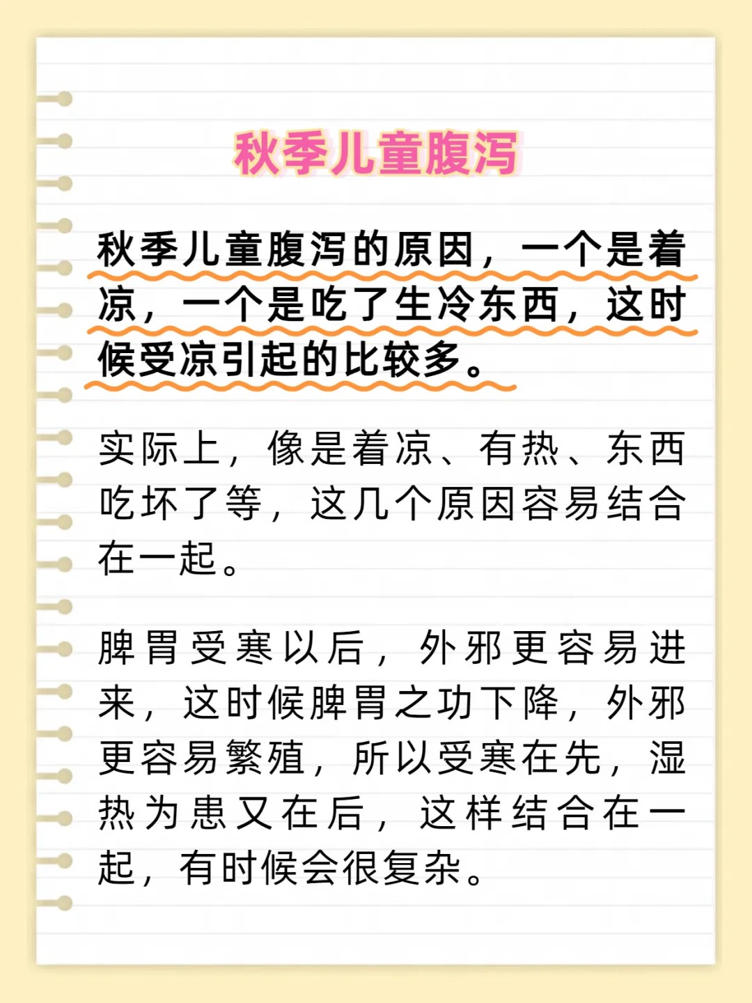 🍂秋季脾胃易出问题 📝延续夏天的习惯,继续吃生冷的东西,是孩子脾胃受寒的重要原因。 秋天,早晚会很凉,中午热,这时候我们依旧保持夏天的习惯,依旧吃凉的,很多孩子也依旧吃很多生冷的东西,比如说冰镇西瓜,一吃吃很多,结果在睡过一夜觉之后,就会出现上吐下泻、肚子疼、甚至会出现发烧感冒的情况。 因为寒湿侵袭了脾胃,这时候会凉。 还有晚上睡觉的时候,有的孩子会踹被,但秋天的晚上温度会下降的,如果窗户又没关严,就会影响到孩子。 很多孩子是睡了一夜觉过后着凉的,这种着凉会上吐下泻,胃疼或者感冒发烧,其中出现最多的就腹泻。 🍂秋季儿童腹泻 📝秋季儿童腹泻的原因,一个是着凉,一个是吃了生冷东西,这时候受凉引起的比较多。 实际上,像是着凉、有热、东西吃坏了等,这几个原因容易结合在一起。 脾胃受寒以后,外邪更容易进来,这时候脾胃之功下降,外邪更容易繁殖,所以受寒在先,湿热为患又在后,这样结合在一起,有时候会很复杂。 🔎解决思路:把受寒的因素祛掉,让脾胃温暖过来 这时候我建议大家用干姜水泡泡脚,喝点干姜熬的水,或者暖宝宝贴在肚子上等等,都有好处。 如果说单纯温暖不行的话,再加点清利湿热的东西,但是首先你要温,不温的话单吃寒凉的💊是不行的,而且还可能会对身体整体起到非常不好的影响。 成人可以服用附子理中丸,老人可以吃肉蔻四神丸。 ‼️提醒大家:在秋天的时候孩子的脾胃容易出问题,所以我们要随着季节的变化来调整看护孩子的方式,同时更加细心的采取相对的对应措施,别让孩子受寒。只有样,才是对孩子真正的负责。 罗大伦 育儿 秋季养生 腹泻 宝宝腹泻 上吐下泻 脾胃虚寒 暖胃 儿童保健