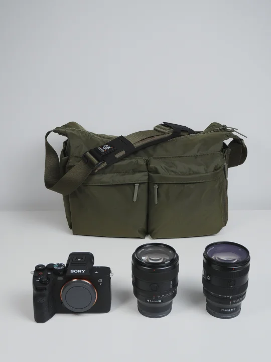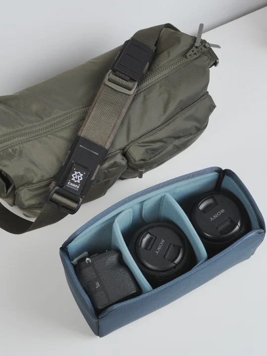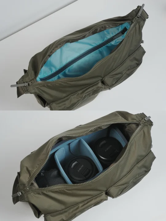 单肩包负责轻装上阵,一机两镜的配置,日常扫街或者突发灵感时拎着就走,轻便得很。说起来这包眼熟不?估计常逛优某库的小伙伴都见过。我特意挑了军绿色,跟双肩包凑成 “兄弟款”,还配了个同厂家的小号内胆包,大小非常适配,不知道的还以为搞了什么联名,其实全凭缘分混搭~