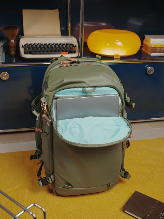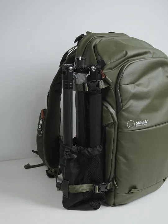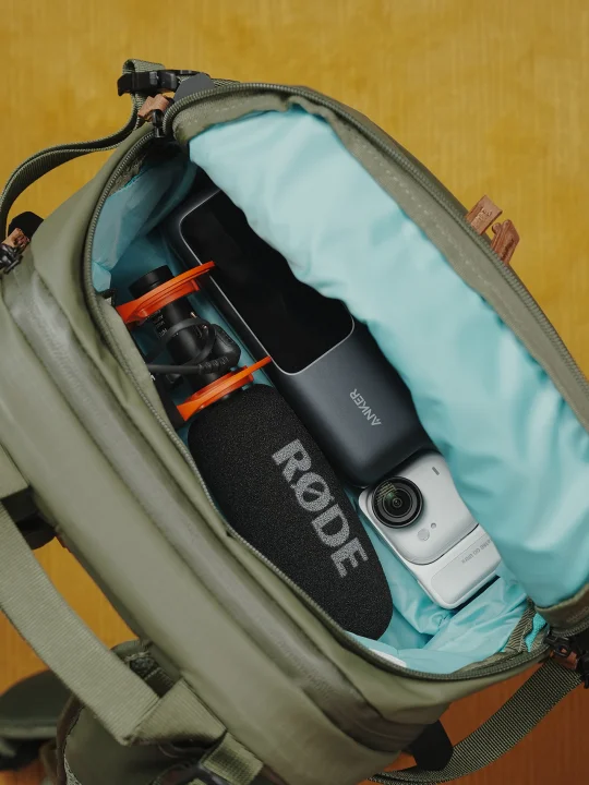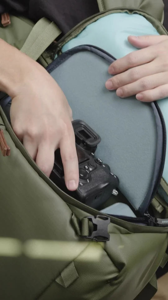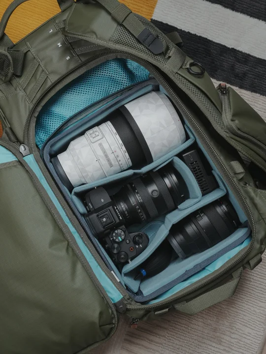 25L 双肩包才是主力选手,干活或短途出行全靠它撑场面。主仓里 A7M4、20-70mm、70-200mm 再塞个 50mm F1.4,器材们各就各位,井然有序;顶部小仓也有不小的空间,隔层多,使用灵活。可以作为摄影器材的拓展空间,比方说运动相机、充电宝、麦克风、补光灯、滤镜等;也可以塞两件换洗衣物。侧面内置隐藏式口袋,可以放水杯和三脚架,伸手就能拿到,不用翻来翻去。