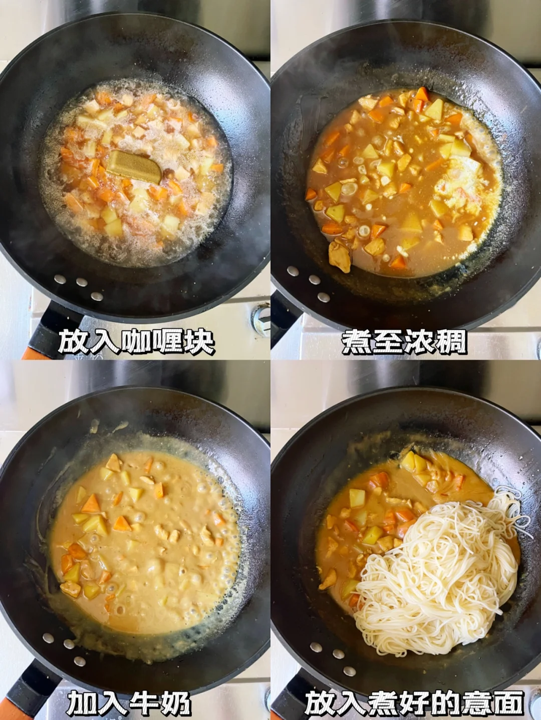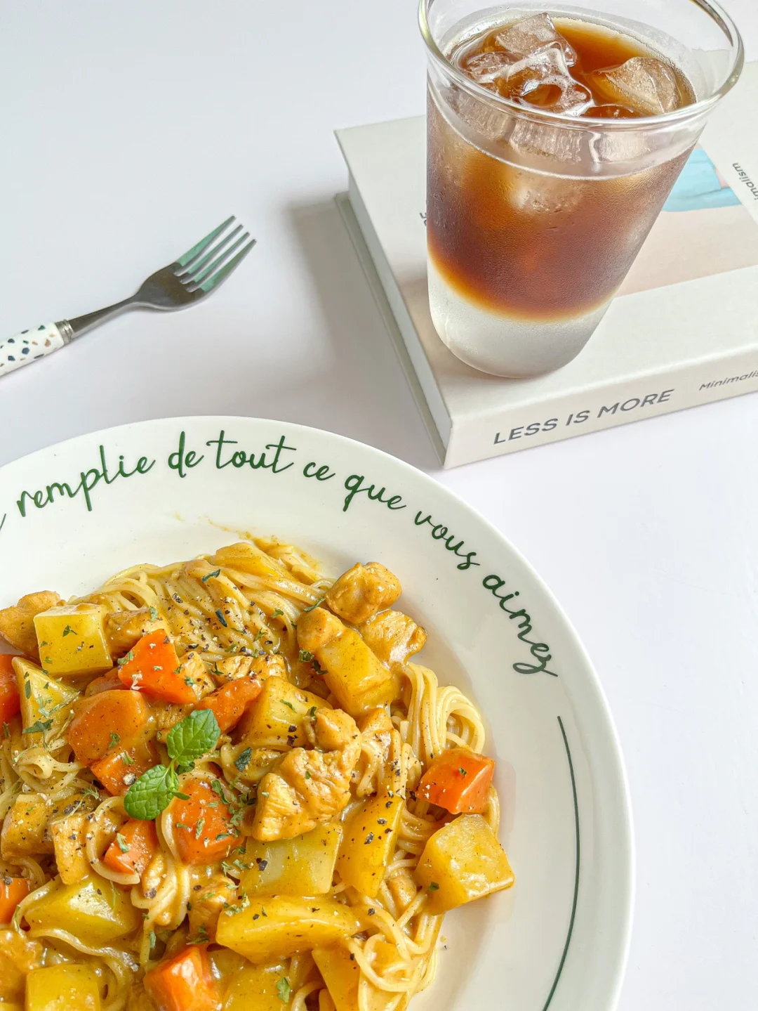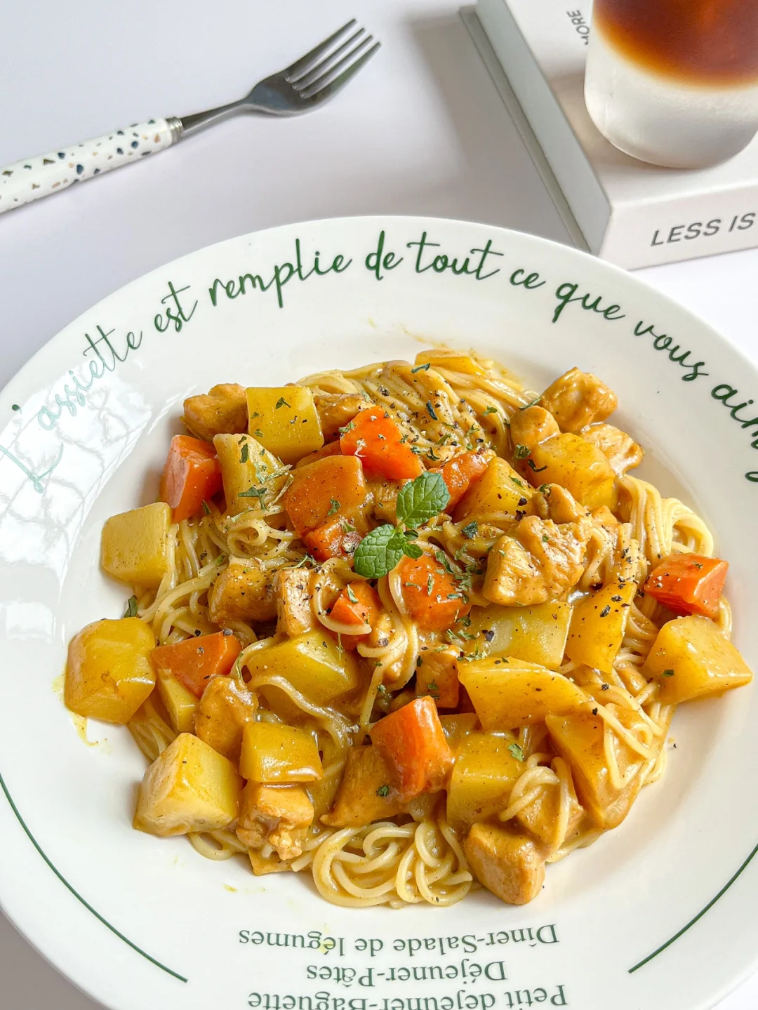 不知道吃什么 翻了翻冰箱 就剩这些食材了 可惜没有洋葱了,不过味道依然不错 ❤️食材:土豆/红萝卜/意面/鸡胸肉/咖喱 ♨️制作: 1️⃣鸡胸肉切小丁➕一勺生抽➕一勺料酒➕一勺蚝油➕黑胡椒,腌制20分钟 2️⃣鸡胸肉炒至变色,捞出备用 3️⃣土豆红萝卜翻炒,加入鸡胸肉翻炒 4️⃣加入清水没过食材,煮15分钟,放入两块咖喱块 5️⃣煮至汤汁微微浓稠 6️⃣意面煮熟放入咖喱中翻拌均匀 搭配一杯椰青冰美式,低卡美味