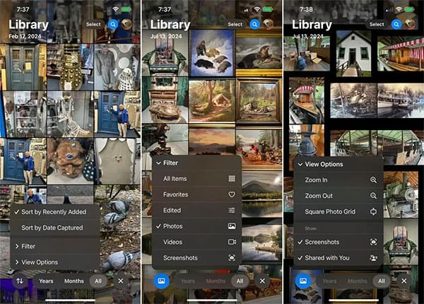在图库中向下滑动即可显示用于筛选和整理照片的新选项。您可以按“最近添加”或“拍摄日期”排序,并应用筛选器仅显示“收藏”、“已编辑照片”、“视频”或“屏幕截图”。