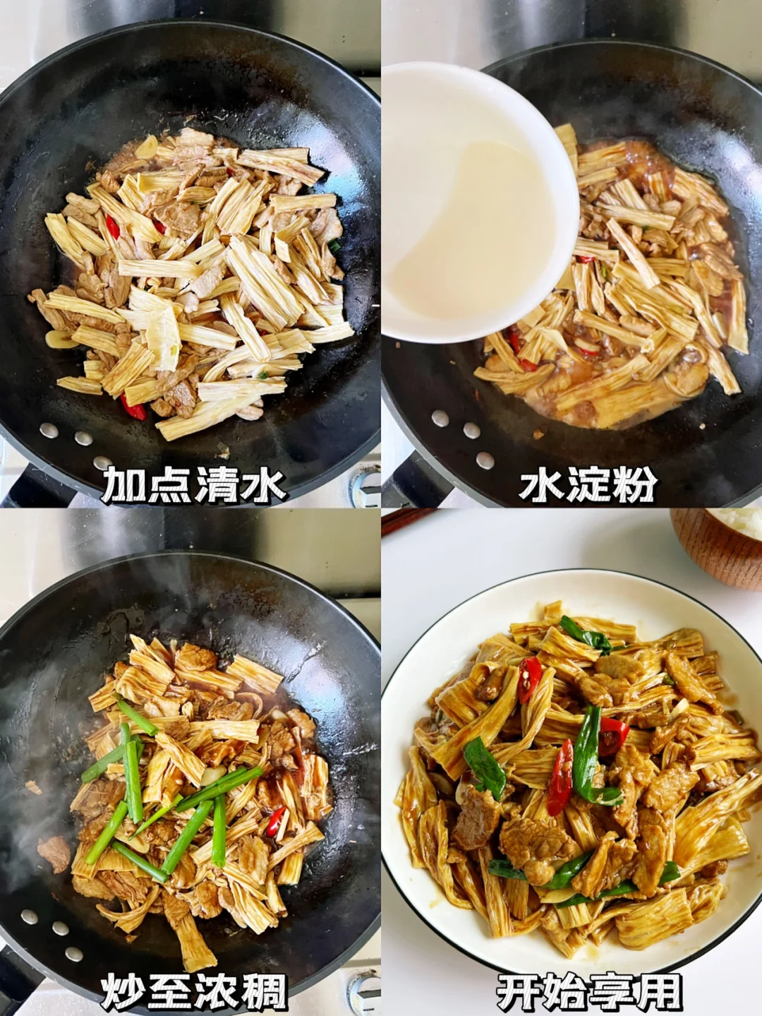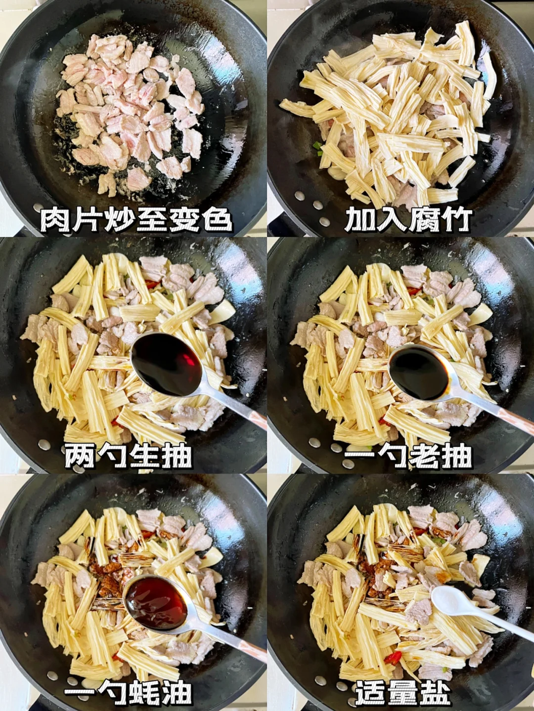 一道好吃的家常菜 好吃又好做 ❤️食材:腐竹/五花肉/葱蒜/小米辣 ♨️制作: 1️⃣腐竹提前泡软 2️⃣五花肉切片炒至变色 3️⃣加葱蒜小米辣翻炒 4️⃣倒入腐竹翻炒加两勺生抽➕一勺老抽➕一勺蚝油➕适量盐➕小半碗清水煮2分钟 5️⃣加入水淀粉翻炒至汤汁浓稠,加入葱段