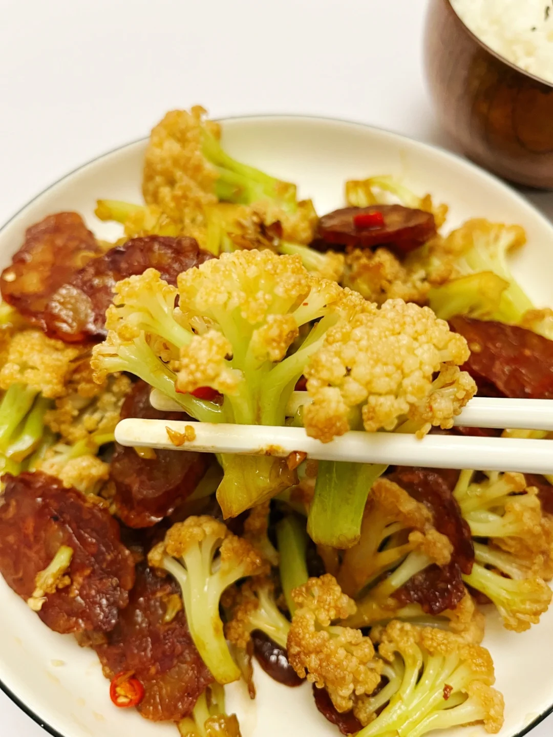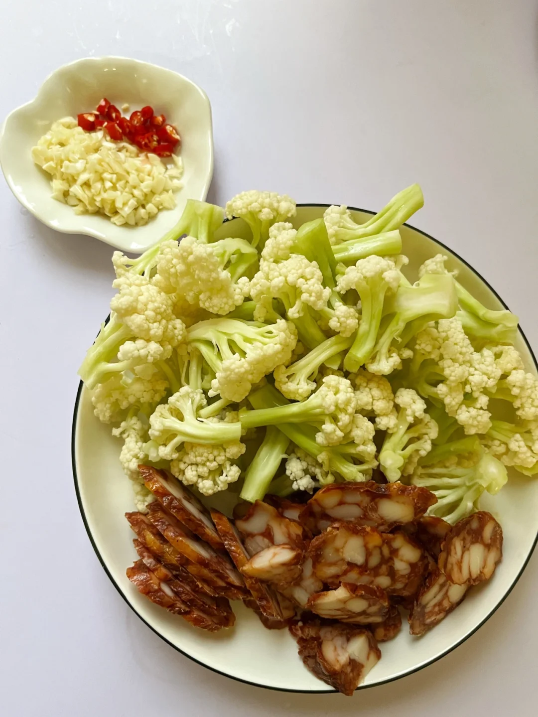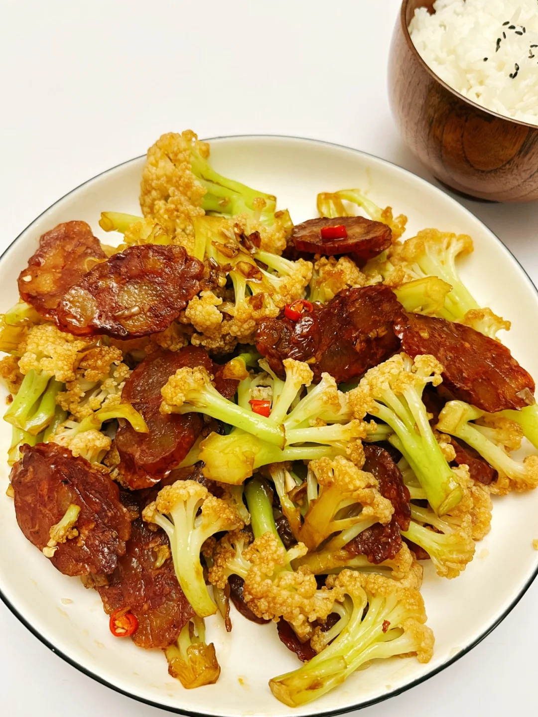 超级简单的下饭菜 又是一个完美组合👍🏻 ❤️食材:花菜/腊肠/蒜末/小米辣 ♨️制作: 1️⃣花菜掰成小瓣,清水中加盐浸泡10分钟,水烧开煮3分钟,捞出控干水分 2️⃣蒜末炒香,倒入腊肠翻炒,倒入花菜 3️⃣一勺生抽➕半勺老抽➕一勺蚝油(腊肠原本就有咸味,重口味的小伙伴可以酌情加点盐) 4️⃣最后加入小米辣翻炒,能吃辣的可以把小米辣和蒜末一起炒,这样辣度更高