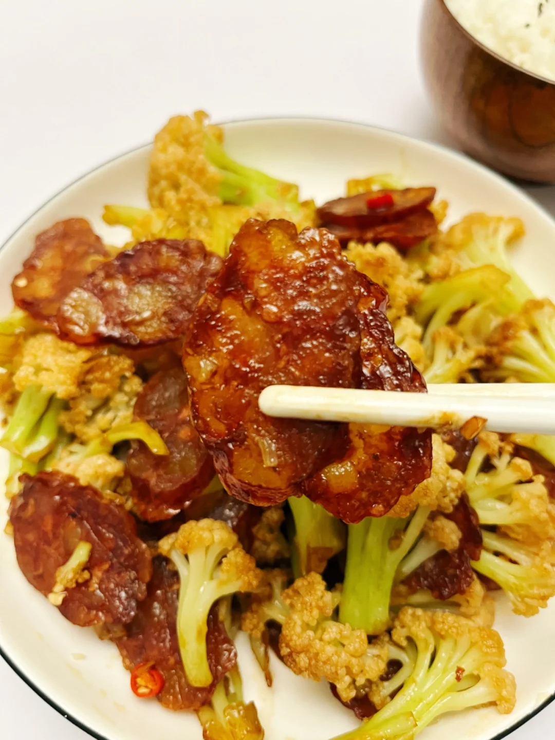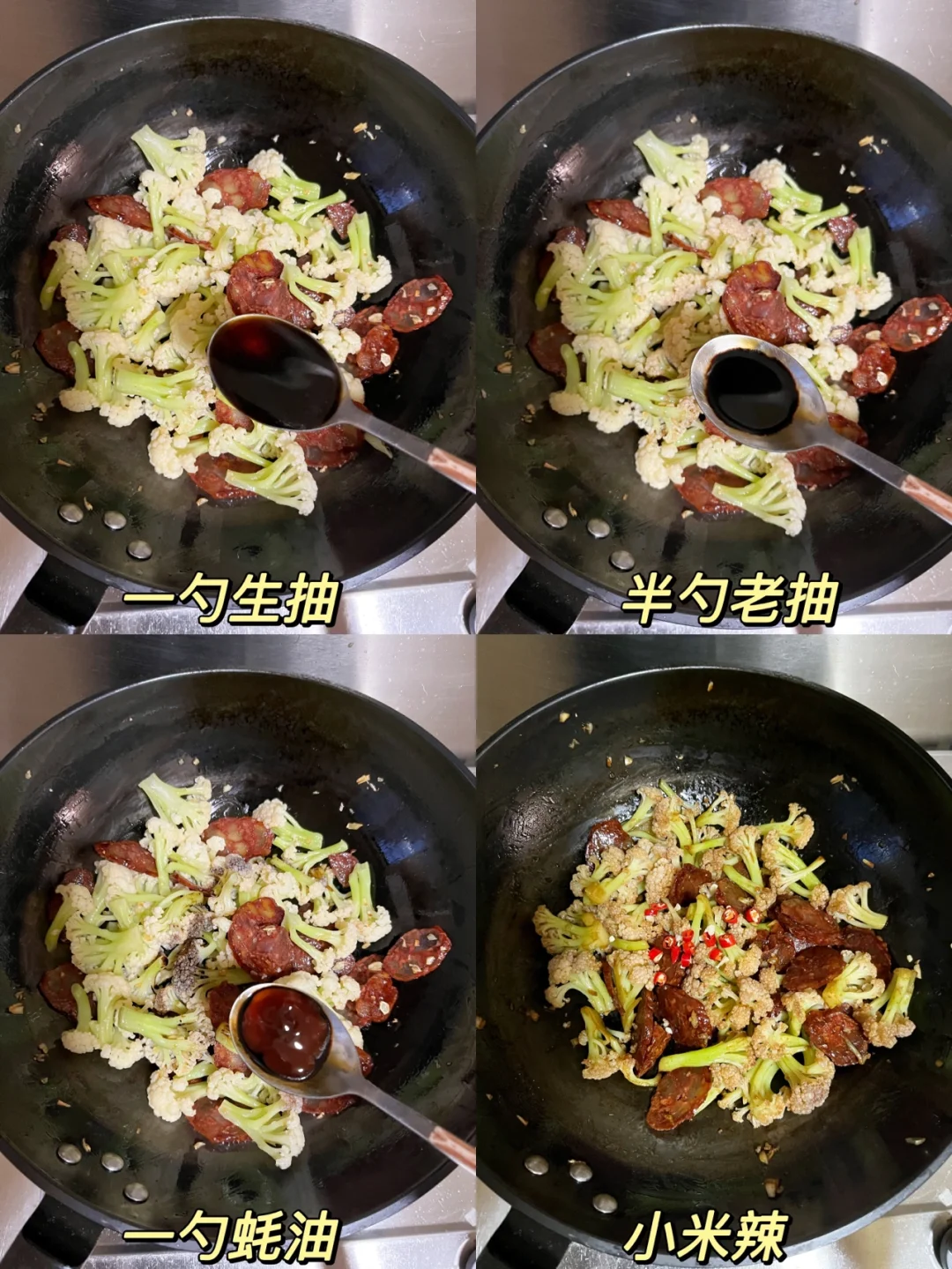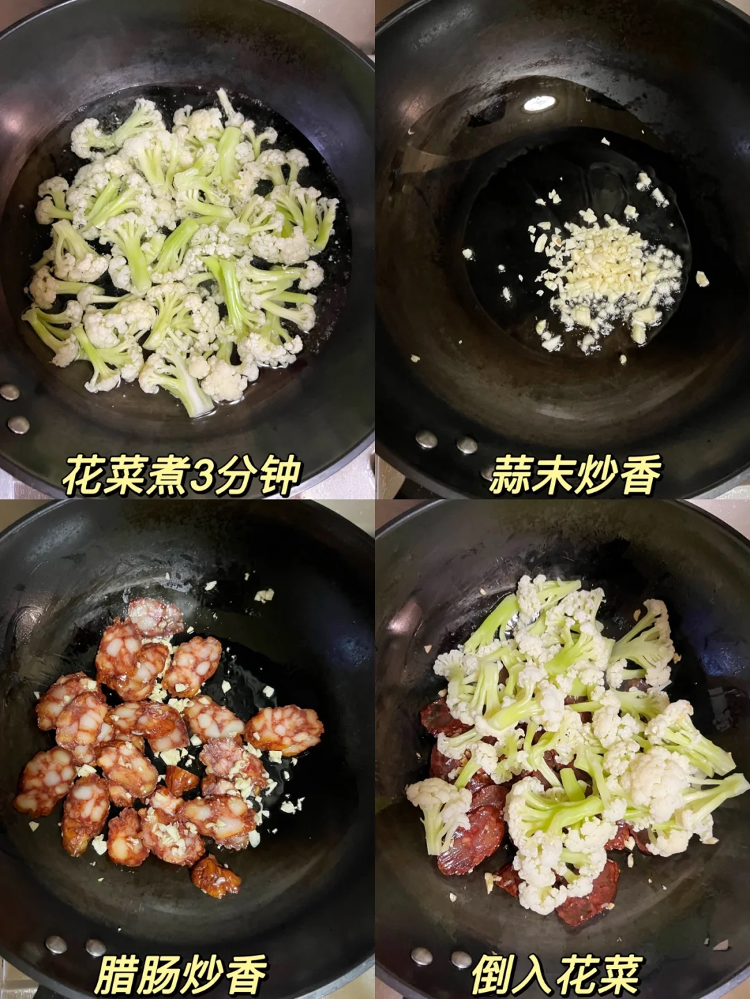 超级简单的下饭菜 又是一个完美组合👍🏻 ❤️食材:花菜/腊肠/蒜末/小米辣 ♨️制作: 1️⃣花菜掰成小瓣,清水中加盐浸泡10分钟,水烧开煮3分钟,捞出控干水分 2️⃣蒜末炒香,倒入腊肠翻炒,倒入花菜 3️⃣一勺生抽➕半勺老抽➕一勺蚝油(腊肠原本就有咸味,重口味的小伙伴可以酌情加点盐) 4️⃣最后加入小米辣翻炒,能吃辣的可以把小米辣和蒜末一起炒,这样辣度更高
