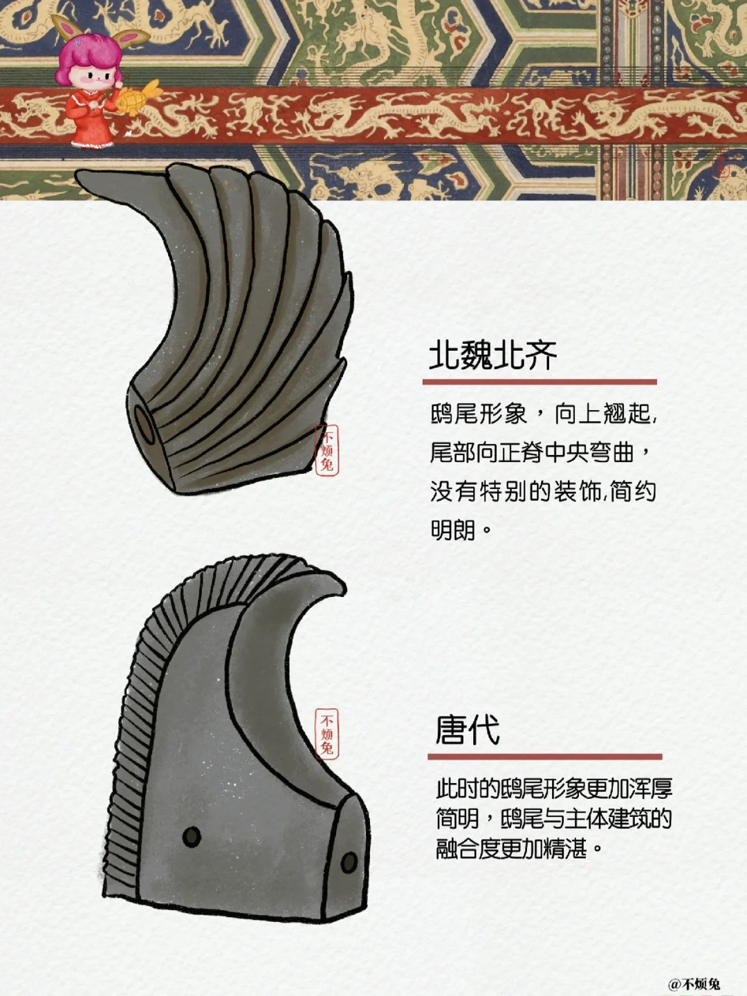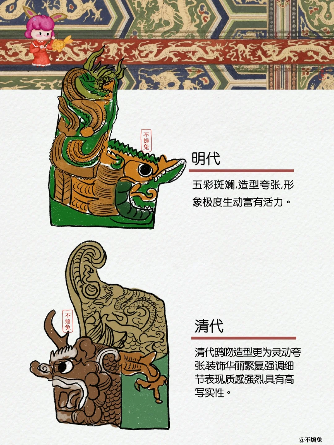 清代鸱吻造型更为灵动夸张,装饰华丽繁复,强调细节表现,质感强烈,具有高写实性。