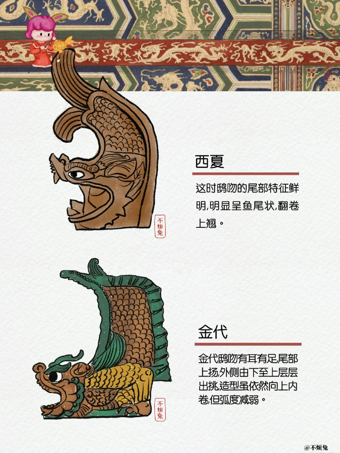 西夏鸱吻的尾部特征鲜明,明显呈鱼尾状,翻卷上翘,与隋、唐甚至更早时期的鸱吻风格更接近。