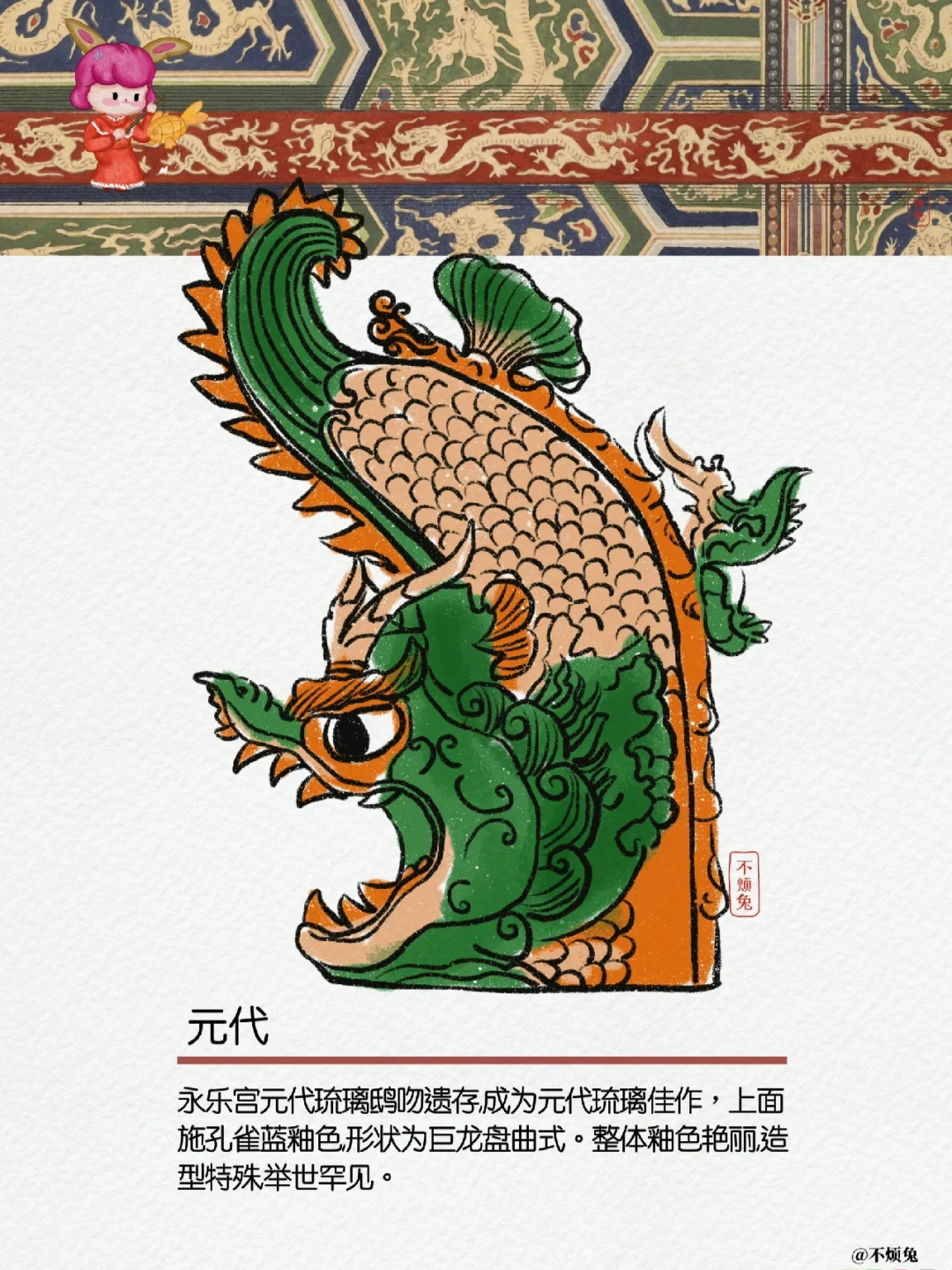 永乐宫元代琉璃鸱吻遗存,成为元代琉璃佳作。是用红泥作胎,上面施孔雀蓝釉色,形状为巨龙盘曲式。整体釉色艳丽,造型特殊,举世罕见。