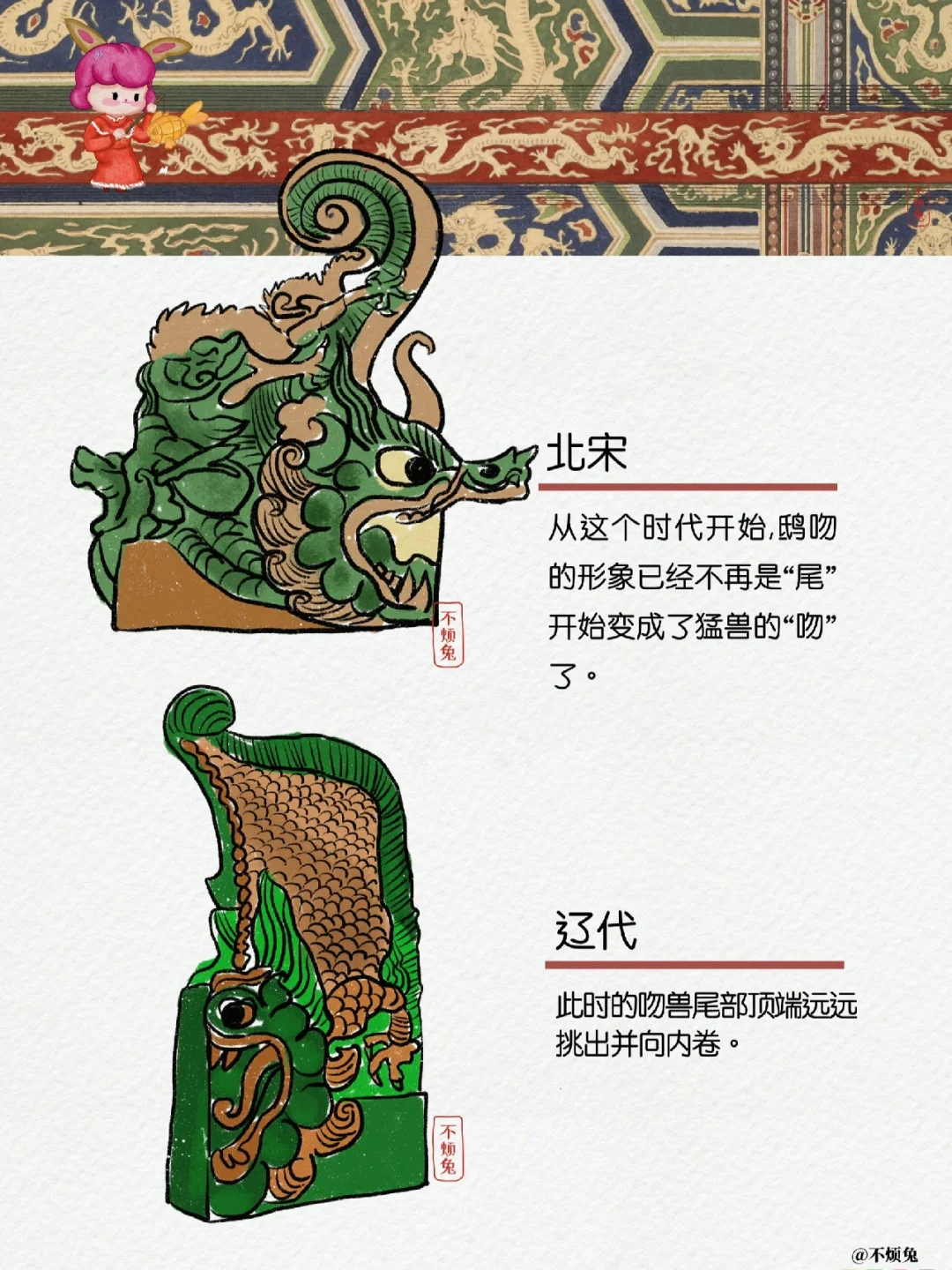 宋代绘画有很多建筑题材的作品,可以直观反映出鸱吻这一构件的时代的造型特色。 《瑞鹤图》手法写实,再现了北宋宫廷建筑的风貌。同样也忠实反映出北宋皇家建筑上鸱吻的具体形象。从这个时代开始,鸱吻的形象已经不再是“尾”开始变成了猛兽的“吻”了。