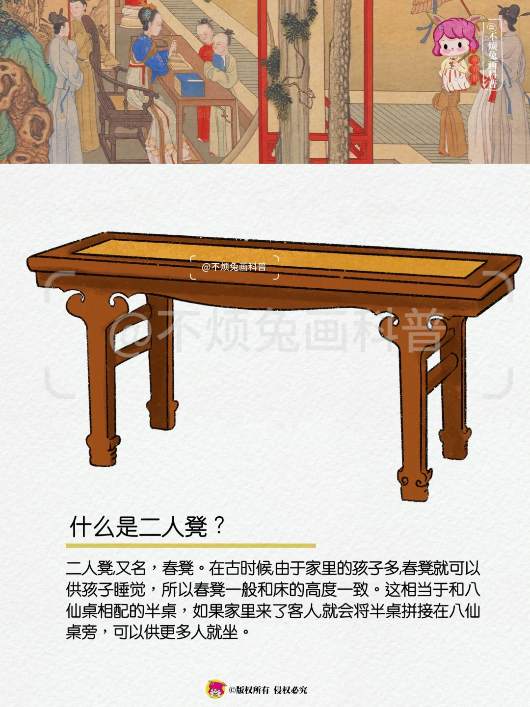 二人凳,又名,春凳。在古时候,由于家里的孩子多,春凳就可以供孩子睡觉,所以春凳一般和床的高度一致。这相当于和八仙桌相配的半桌,如果家里来了客人,就会将半桌拼接在八仙桌旁,可以供更多人就坐。