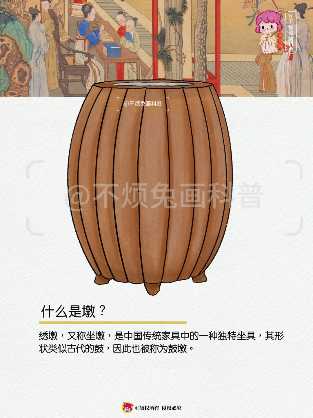 绣墩,又称坐墩,是中国传统家具中的一种独特坐具,其形状类似古代的鼓,因此也被称为鼓墩。