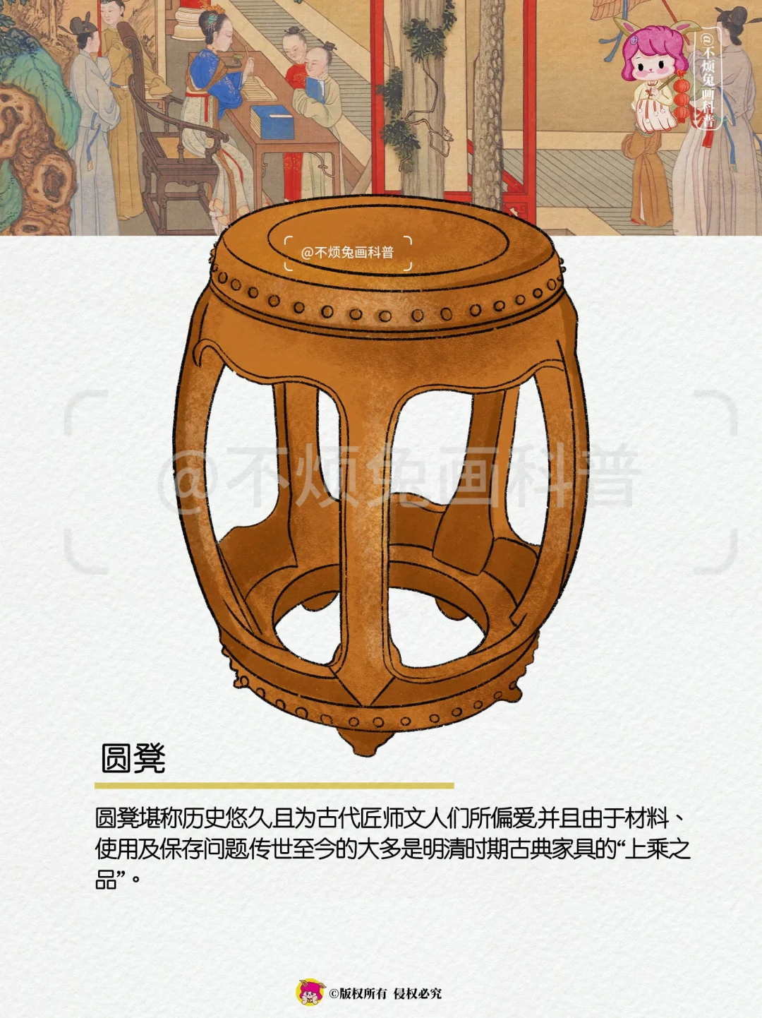 圆凳堪称历史悠久,且为古代匠师文人们所偏爱,并且由于材料、使用及保存问题,传世至今的大多是明清时期古典家具的“上乘之品”。