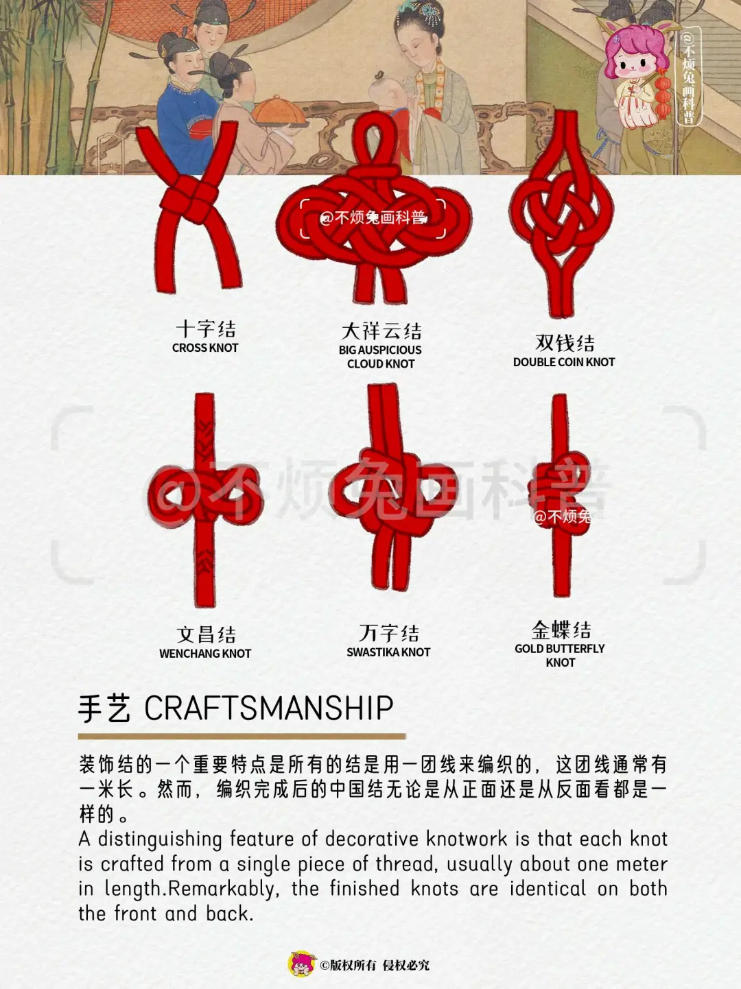 装饰结的一个重要特点是所有的结是用一团线来编织的,这团线通常有一米长。然而,编织完成后的中国结无论是从正面还是从反面看都是一样的。