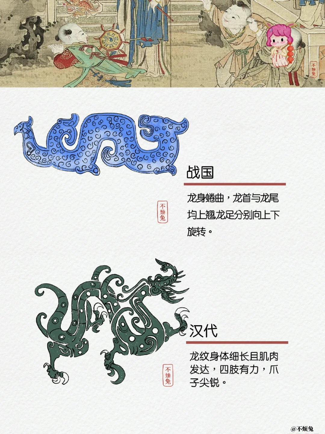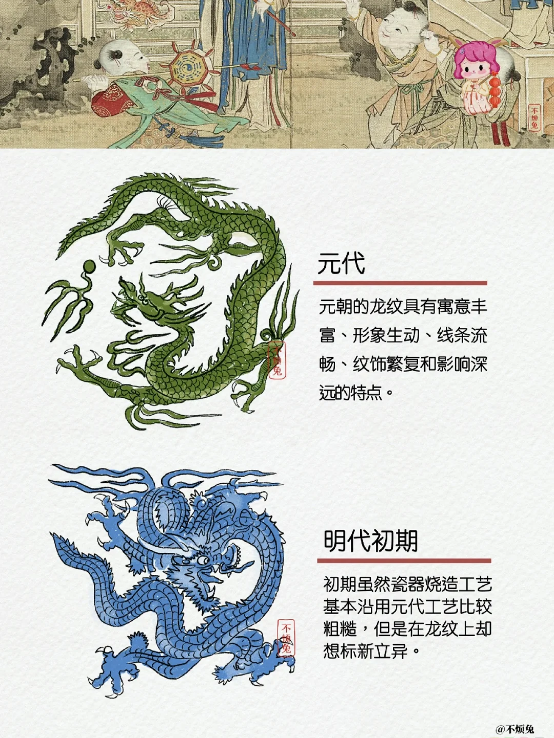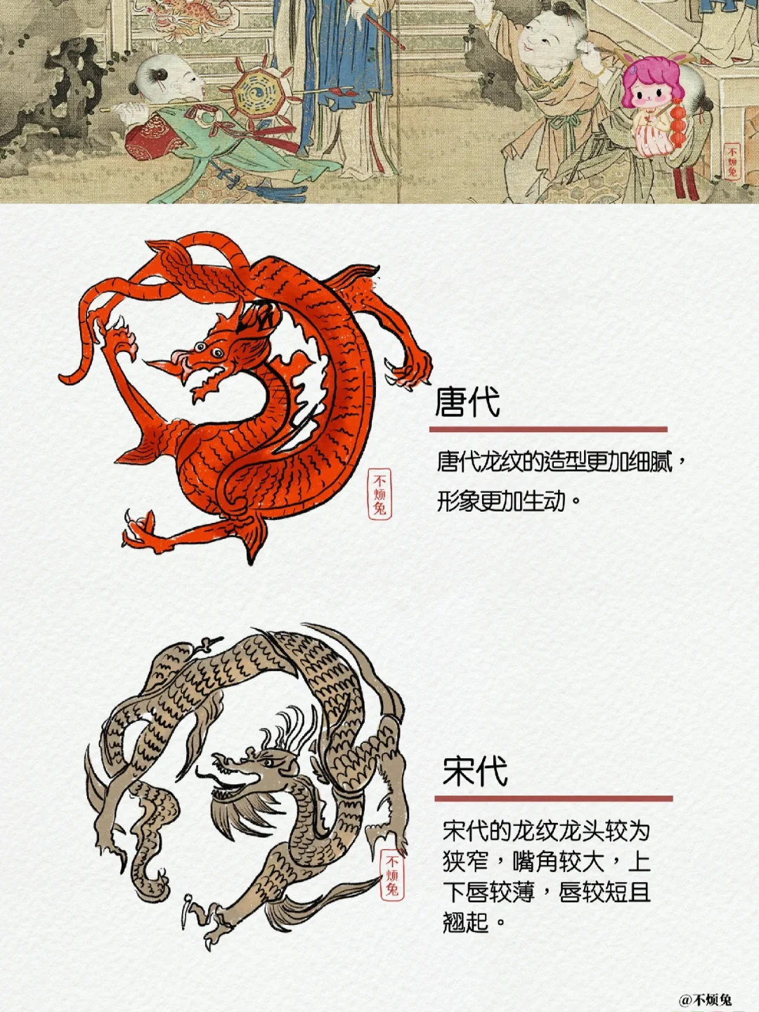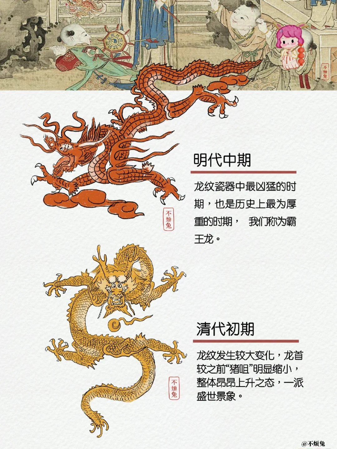 🐲龙纹在不同朝代应用广泛,宫廷龙纹和民间龙纹形成了同步发展。宫廷龙纹造型突出神性,金碧辉煌、精巧典雅;民间龙纹则寓意吉祥、素雅秀美、气韵生动。