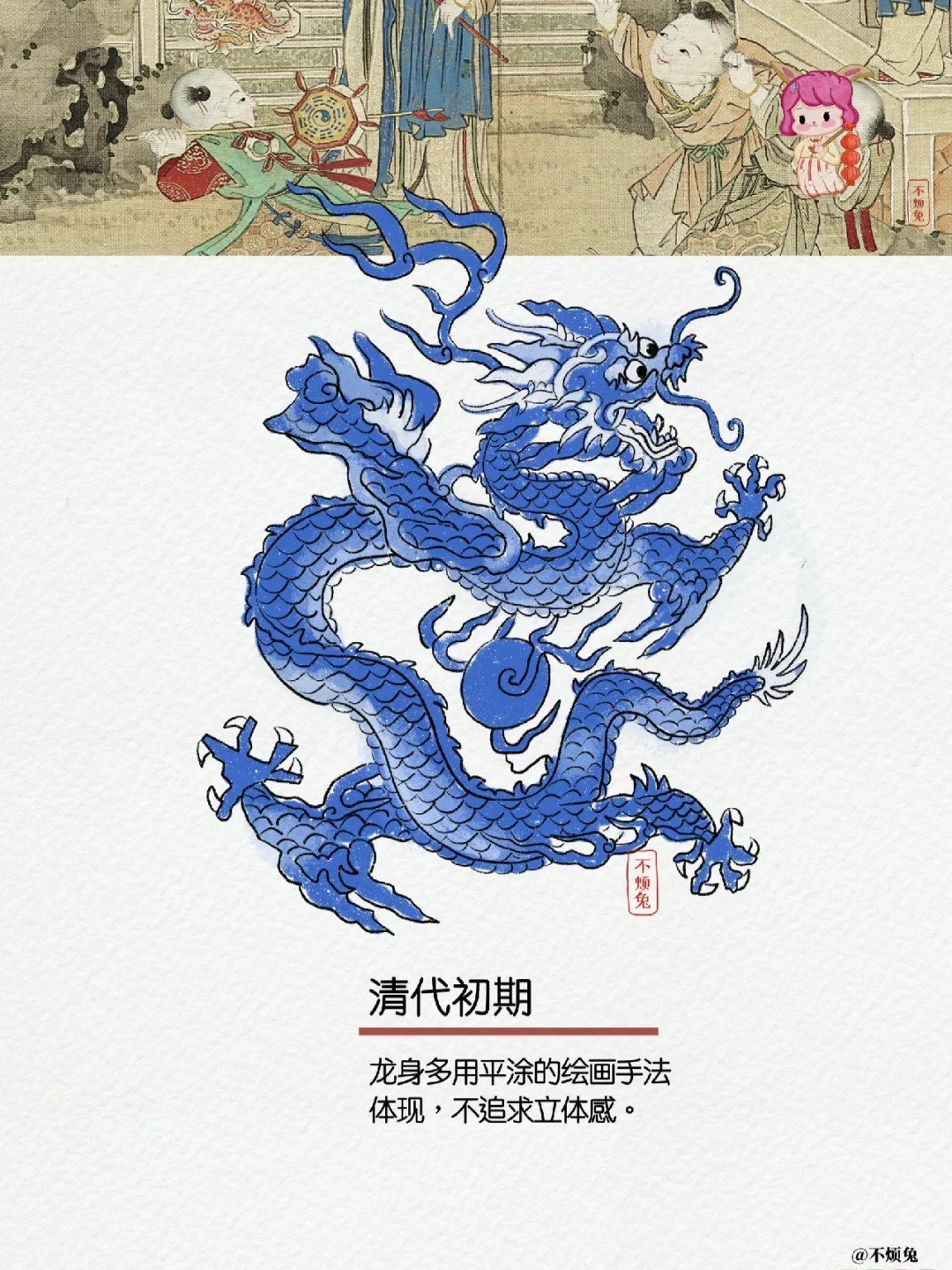 龙身多用平涂的绘画手法体现,不追求立体感。头方眼圆,龙眼常勾描圆形轮廓线后,再以实笔点出圆点状眼珠。
