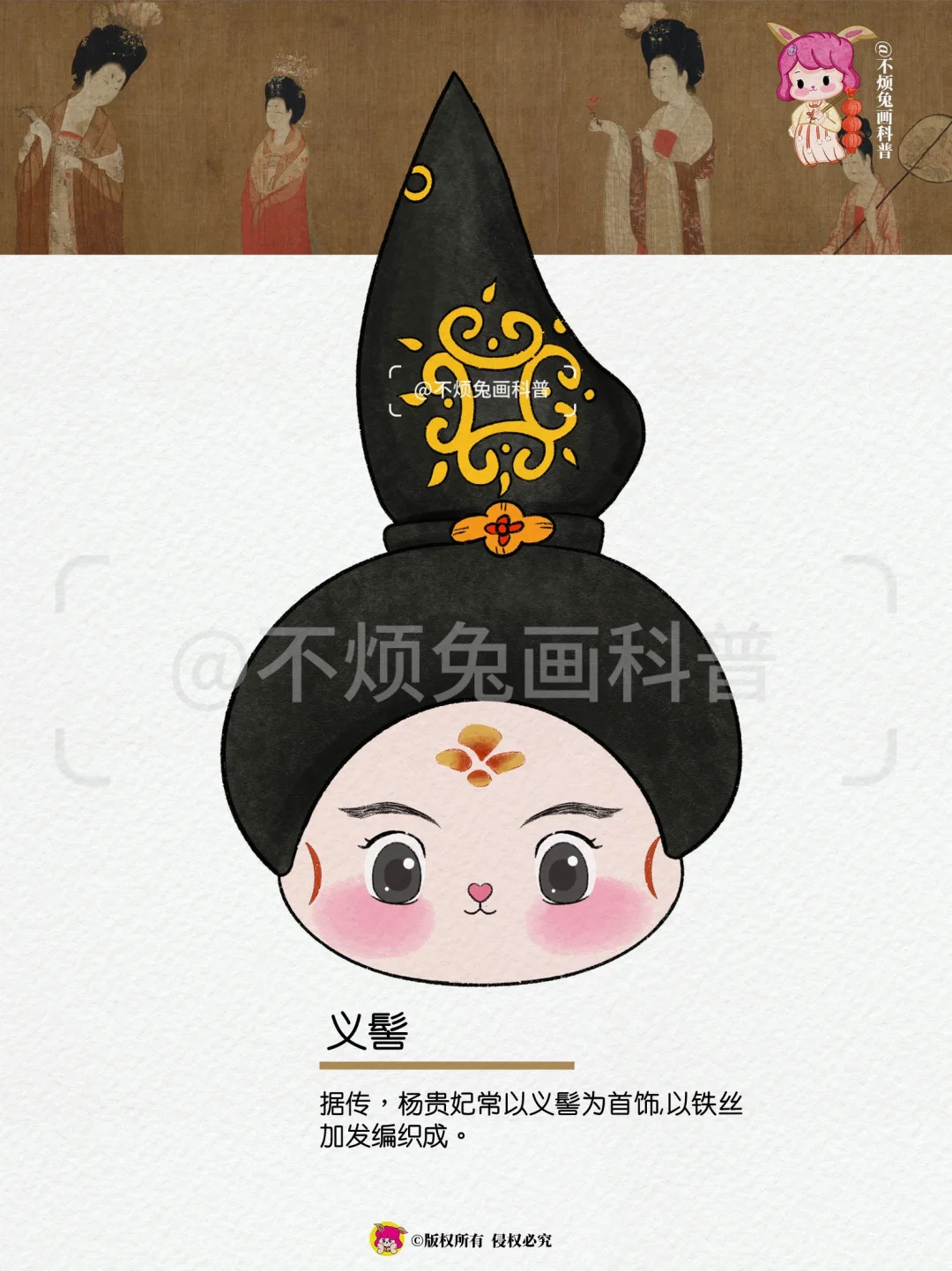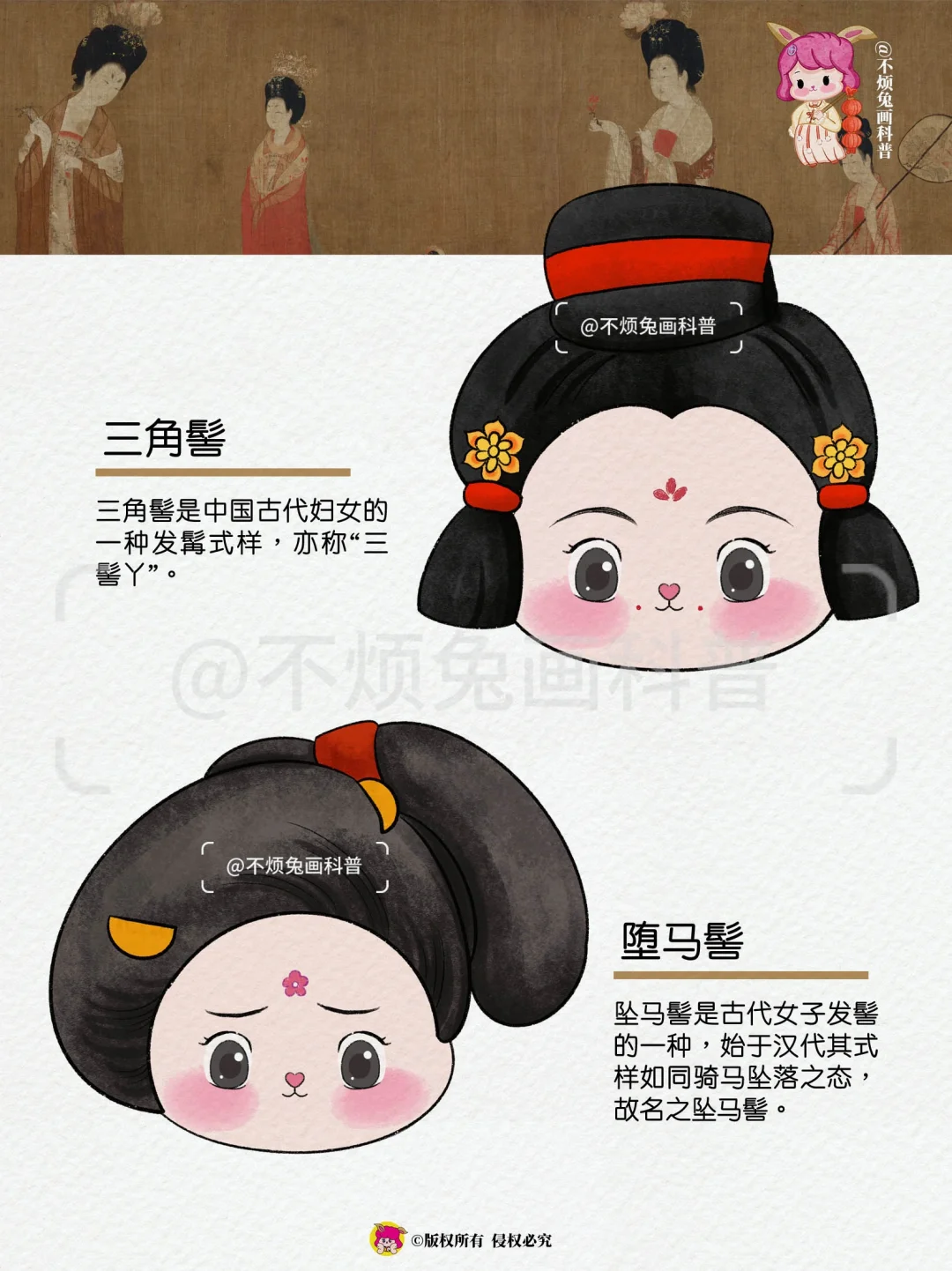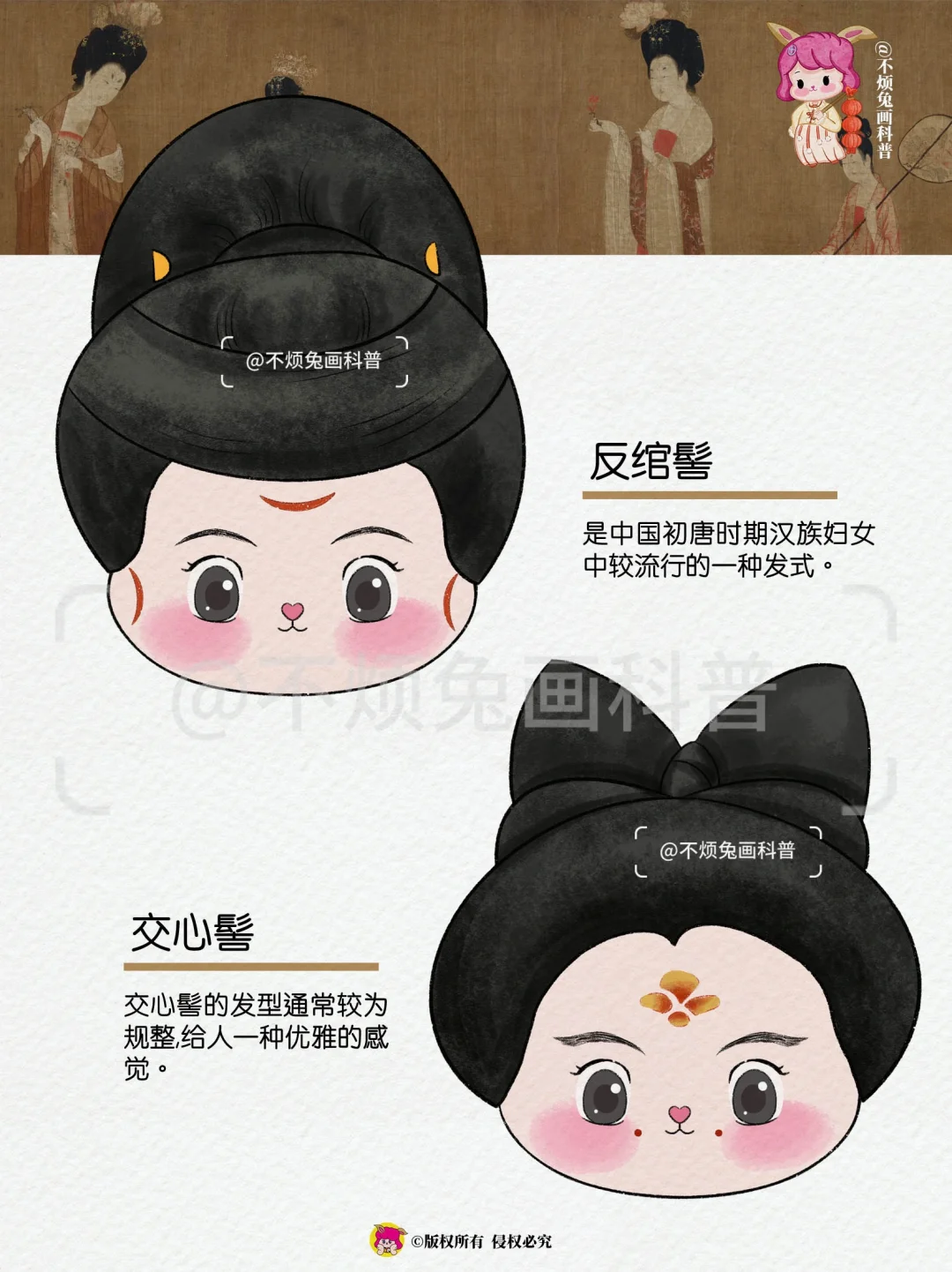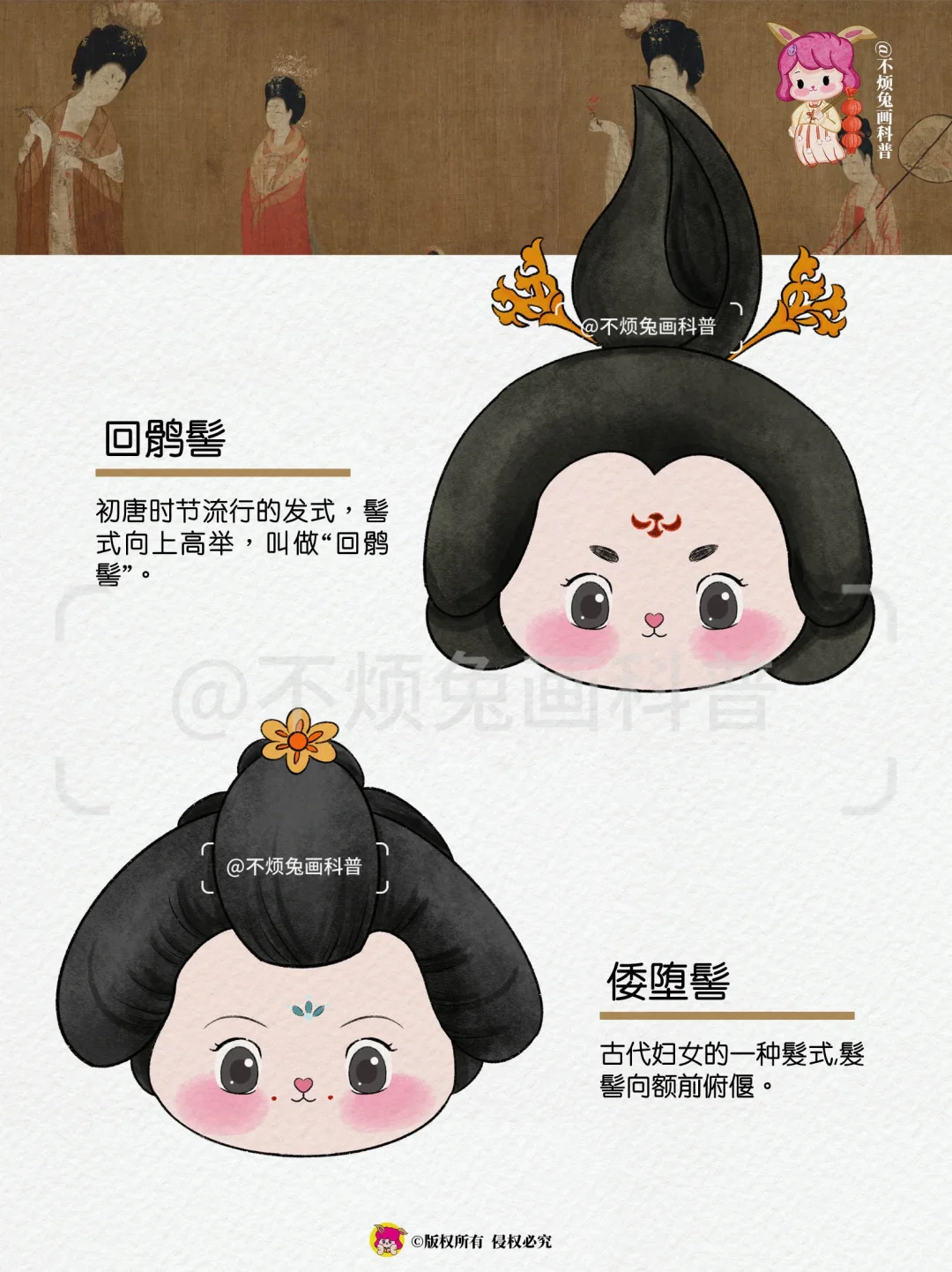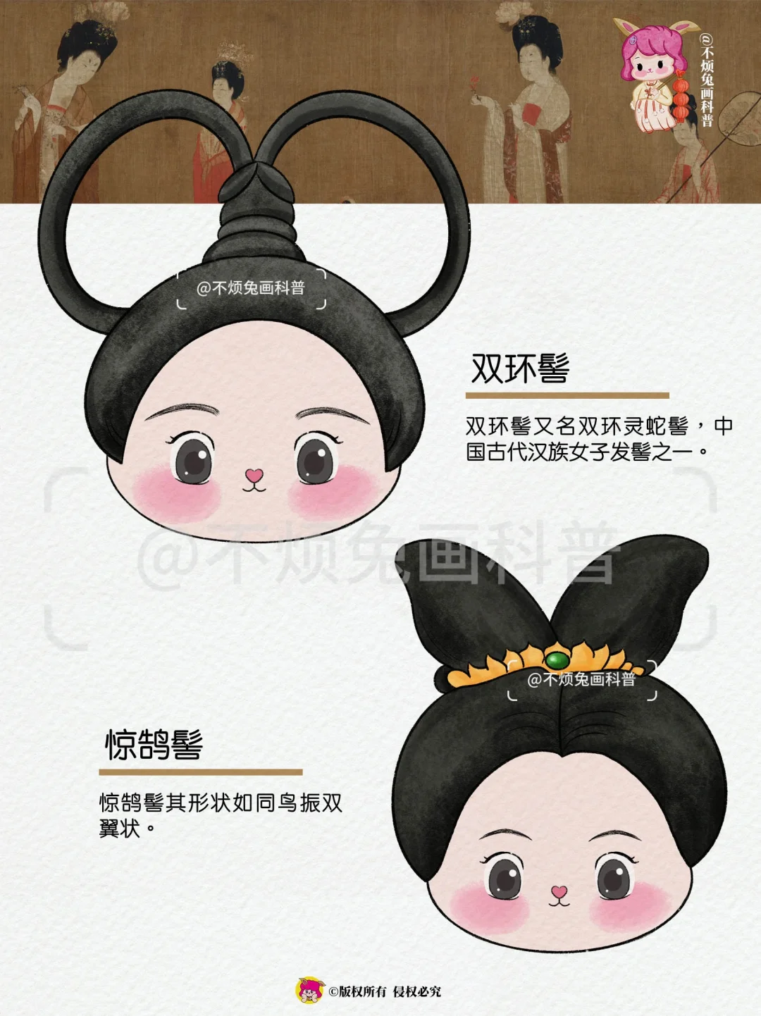 🪞发式与妆造是古代女子区别于男子的重要修饰手段,唐代女子的发髻样式与名称,数不胜数,丰富多彩。今天我们一起来看看唐代女子丰富的发髻吧! - 1️⃣义髻 2️⃣双环髻 3️⃣惊鹄髻 4️⃣反绾髻 5️⃣交心髻 6️⃣回鹘髻 7️⃣倭堕髻 8️⃣三角髻 9️⃣堕马髻 -