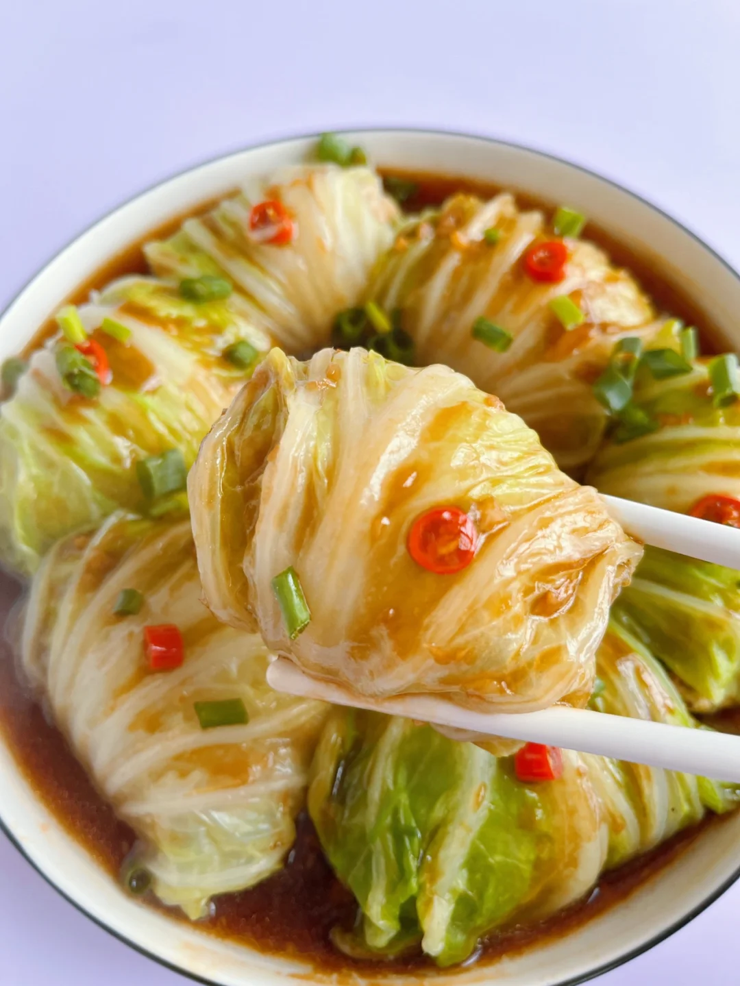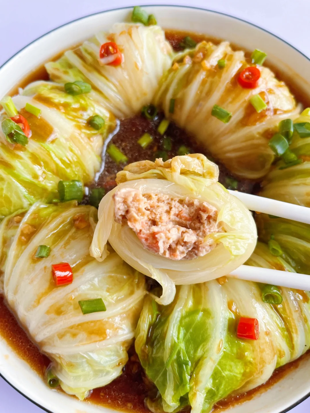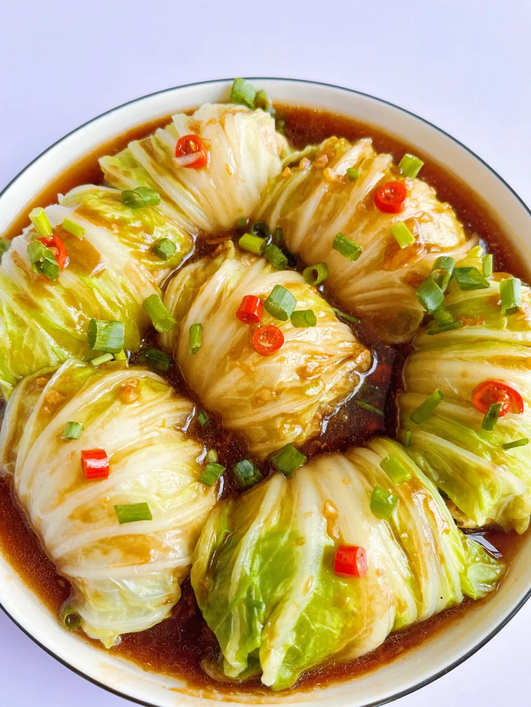 7️⃣最后将汤汁浇在蒸好的白菜上,撒上葱花