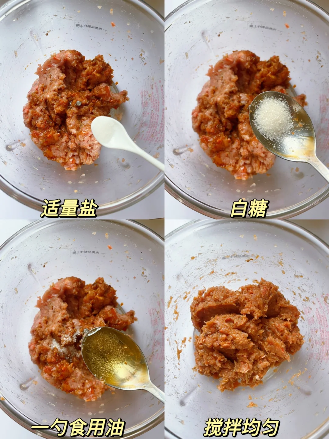 1️⃣猪肉绞成肉沫,加胡萝卜香菇搅碎