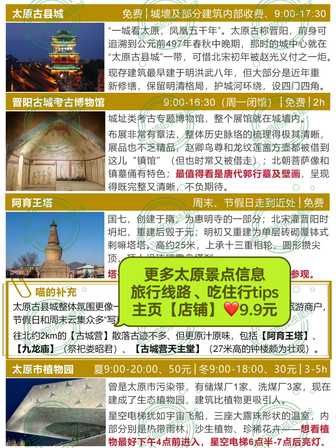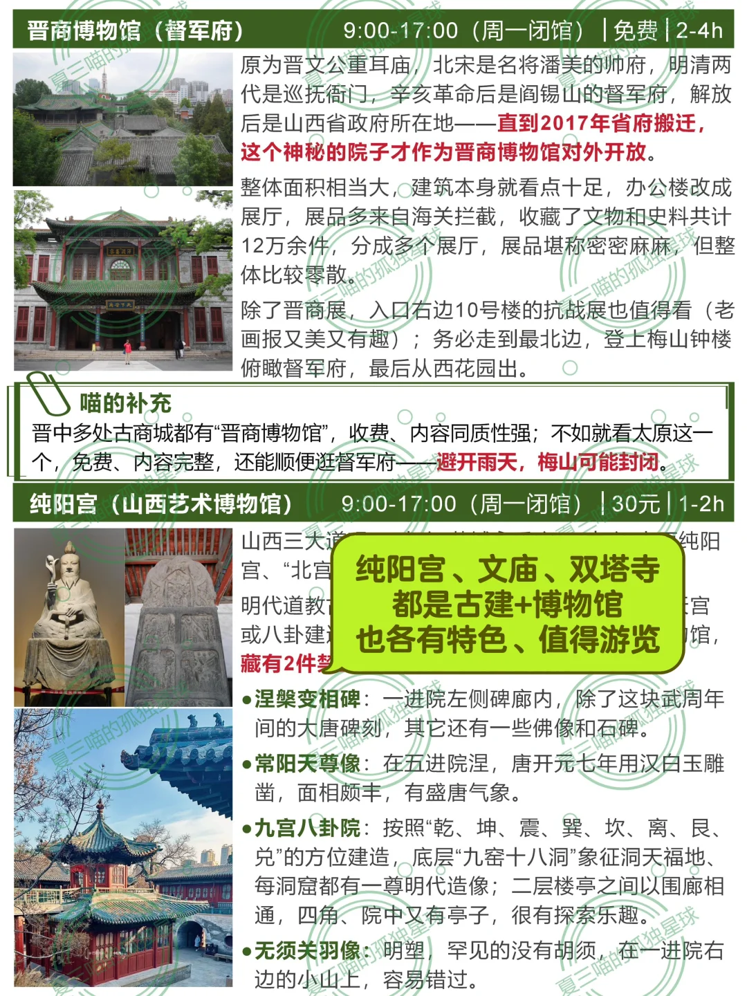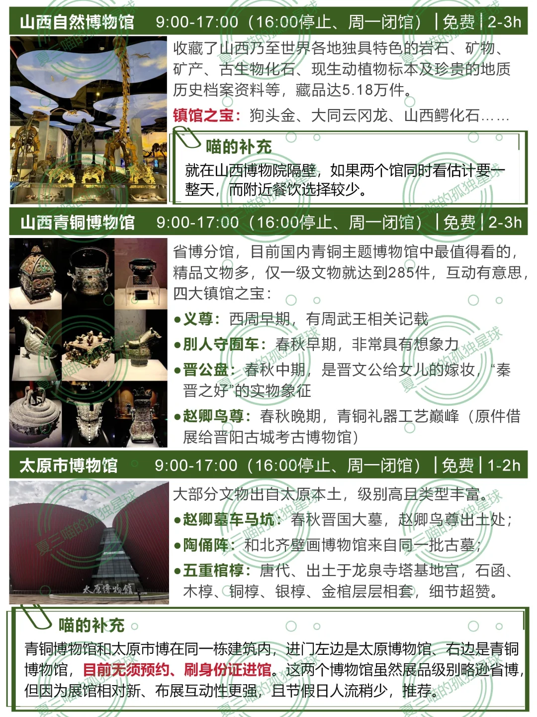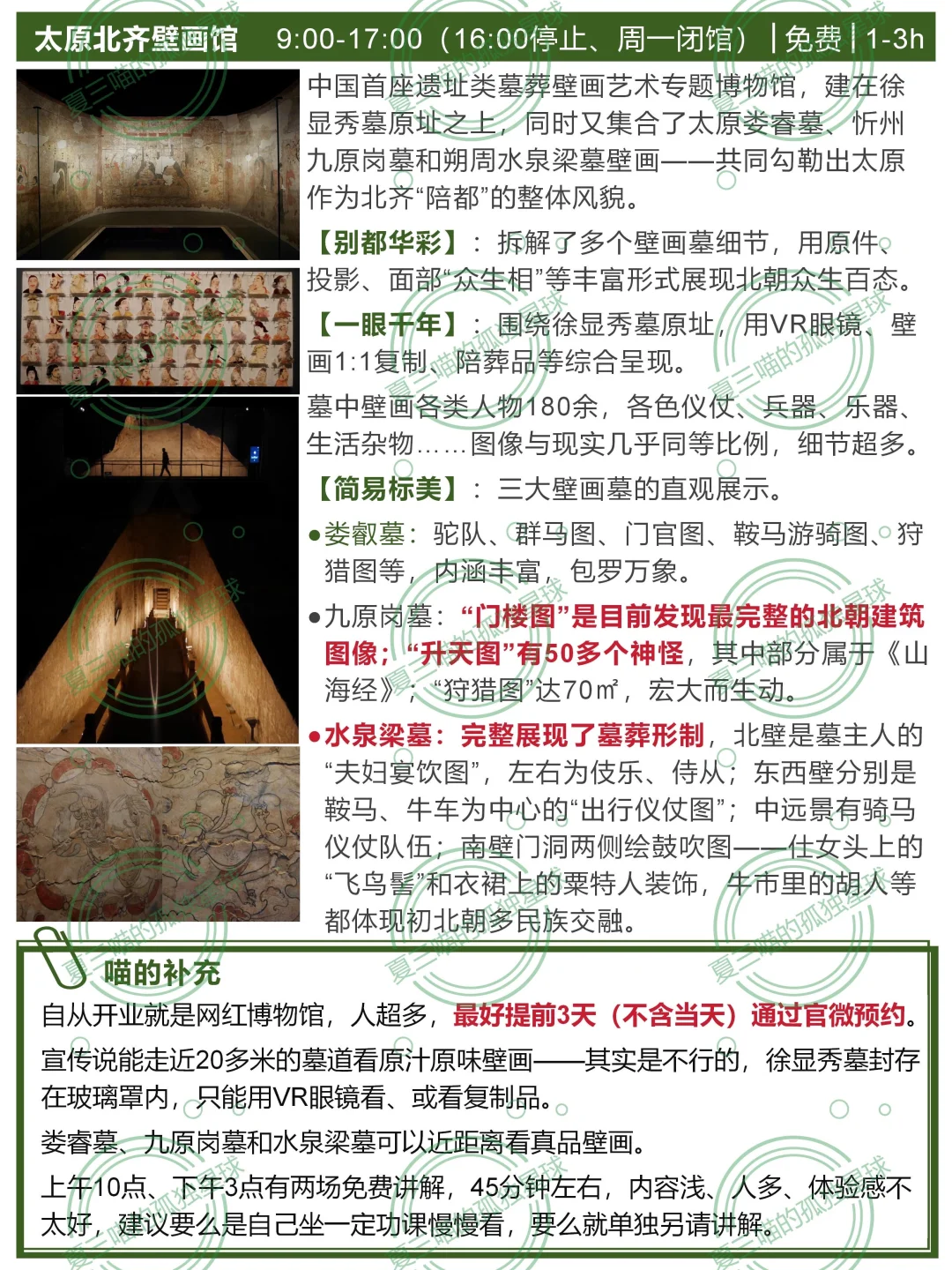 欢迎打开夏三喵的第[九R][六R]篇山西笔记! 完整版106页《山西旅行指南》[向右R]评论自取 —— 太原有101个博物馆(完整名单见图📸14-17) 除了山西博物院(▶️上篇笔记有介绍),这4个也是喵的心头好: [一R]喜欢看文物、尤其是青铜? 📍青铜博物馆+太原市博物馆 两个馆在一起,文物水准仅此于省博,布展互动性更强。 🔸青铜馆四大镇馆之宝 义尊:有周武王相关记载 刖人守囿车:极具想象力 晋公盘:晋文公给女儿的嫁妆,“秦晋之好” 赵卿鸟尊:青铜礼器工艺巅峰 🔸市博各种“探墓” 春秋赵卿车马坑、唐代壁画墓、金代砖雕墓…… 陶俑阵:和北齐壁画来自同一批古墓 五重棺椁:出土于龙泉寺唐代地宫,石函、木椁、铜椁、银椁、金棺层层相套 [二R]喜欢看壁画,想了解北齐风貌? 📍太原北齐壁画博物馆 网红馆,人超多,提前3天官微预约。 四大古墓共同勾勒出太原作为北齐“陪都”的整体风貌。 🔸徐显秀墓:封存在玻璃罩内,有VR、1:1复制、陪葬品等综合呈现,细节超多。 🔸娄叡墓:驼队、群马图、门官图、鞍马游骑图、狩猎图…… 🔸九原岗墓:“门楼图”有完整的北朝建筑;“升天图”有50多个神怪,其中部分属于《山海经》;“狩猎图”达70㎡,宏大生动。 🔸水泉梁墓:仕女头上的“飞鸟髻”、衣裙上的粟特人装饰、牛市里的胡人等都体现初北朝多民族交融。 [三R]对曾经的督军府有好奇? 🔸晋商博物馆 最早是晋文公重耳庙,北宋是名将潘美的帅府,明清两代是巡抚衙门,辛亥革命后是阎锡山的督军府,解放后是山西省政府——直到近年,这个神秘的院子才作为晋商博物馆对外开放。 建筑本身就极有看点,展品堪称密密麻麻,登上梅山钟楼可以俯瞰太原老城。 [四R]节假日不想人挤人? 📍晋阳古城考古博物馆 “一城看太原,凤凰五千年”。 太原古称晋阳,公元前497年建城,可惜北宋初年被赵光义付之一炬。 博物馆建在复原后的城墙内,历史脉络的梳理得极其清晰,也不乏精品文物。 ⚠️唐代郭行墓及壁画必看,完整又清晰。 —— 更多小众好地方[向右R]