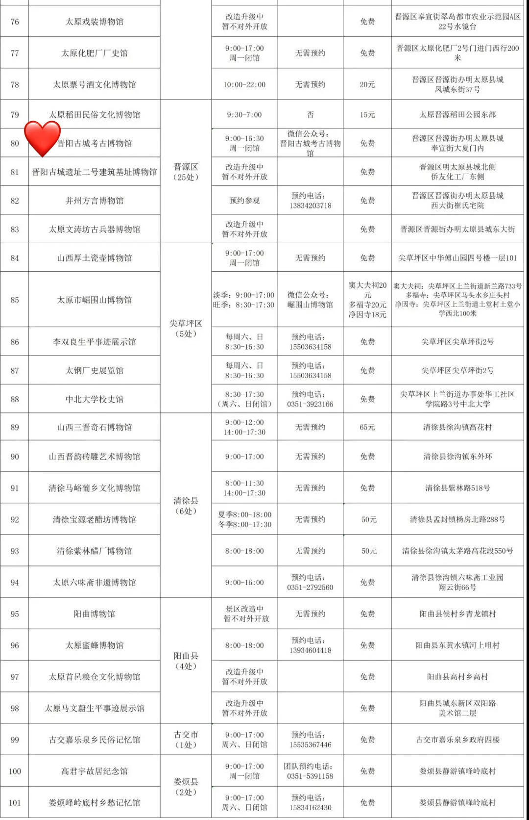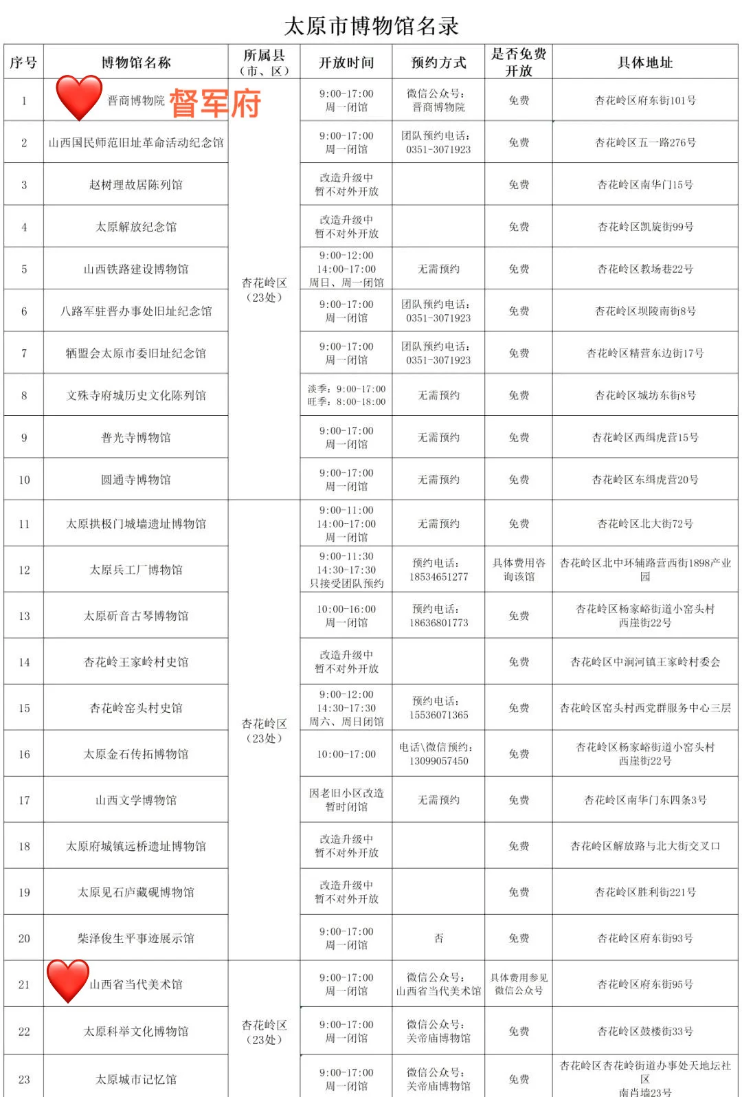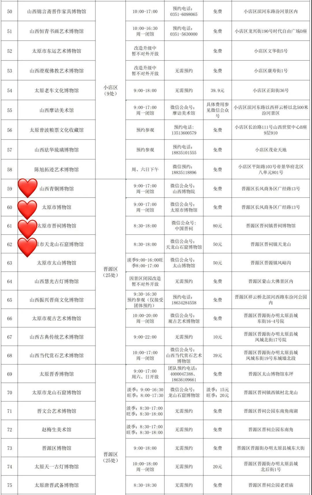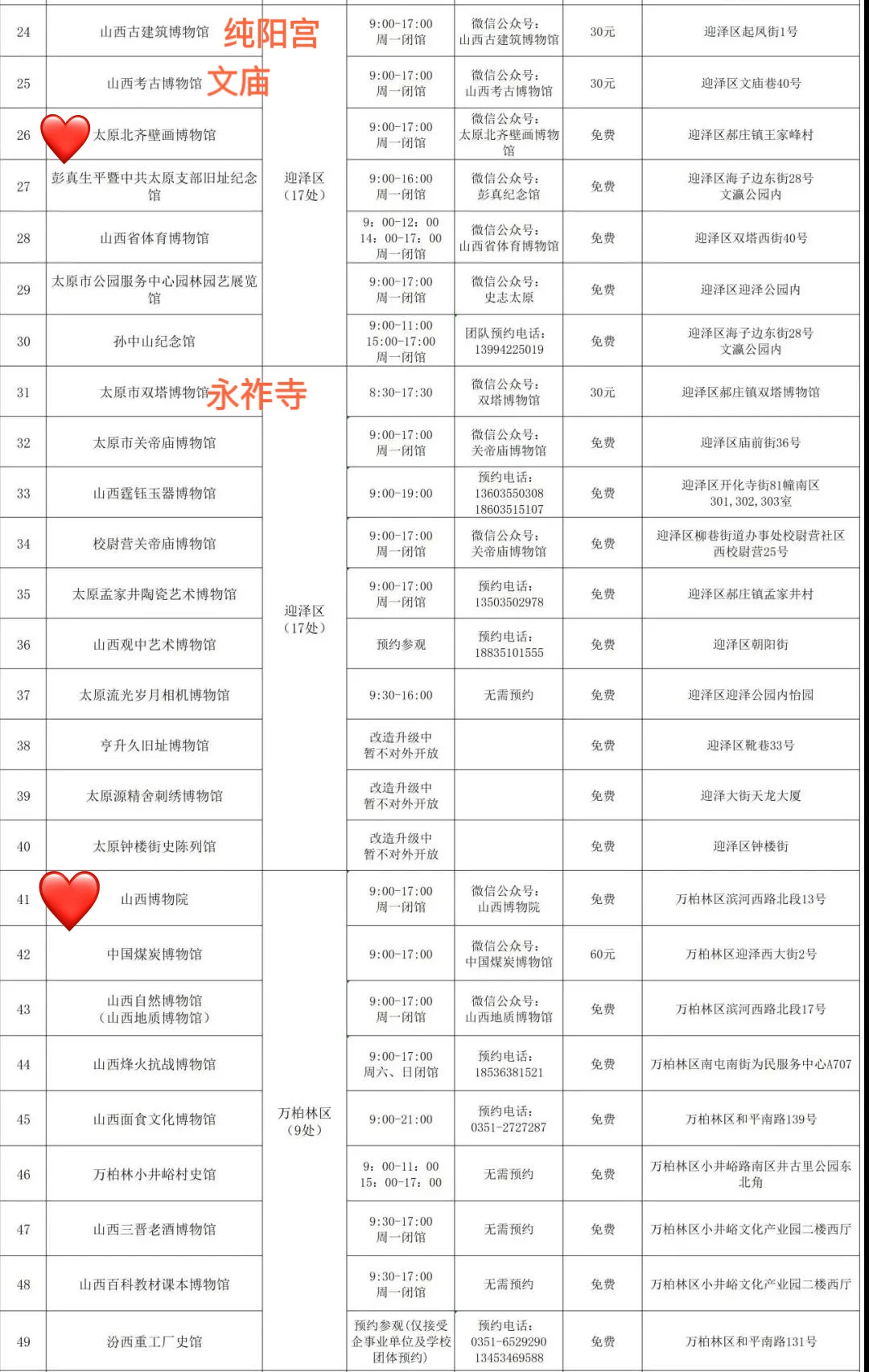 欢迎打开夏三喵的第[九R][六R]篇山西笔记! 完整版106页《山西旅行指南》[向右R]评论自取 —— 太原有101个博物馆(完整名单见图📸14-17) 除了山西博物院(▶️上篇笔记有介绍),这4个也是喵的心头好: [一R]喜欢看文物、尤其是青铜? 📍青铜博物馆+太原市博物馆 两个馆在一起,文物水准仅此于省博,布展互动性更强。 🔸青铜馆四大镇馆之宝 义尊:有周武王相关记载 刖人守囿车:极具想象力 晋公盘:晋文公给女儿的嫁妆,“秦晋之好” 赵卿鸟尊:青铜礼器工艺巅峰 🔸市博各种“探墓” 春秋赵卿车马坑、唐代壁画墓、金代砖雕墓…… 陶俑阵:和北齐壁画来自同一批古墓 五重棺椁:出土于龙泉寺唐代地宫,石函、木椁、铜椁、银椁、金棺层层相套 [二R]喜欢看壁画,想了解北齐风貌? 📍太原北齐壁画博物馆 网红馆,人超多,提前3天官微预约。 四大古墓共同勾勒出太原作为北齐“陪都”的整体风貌。 🔸徐显秀墓:封存在玻璃罩内,有VR、1:1复制、陪葬品等综合呈现,细节超多。 🔸娄叡墓:驼队、群马图、门官图、鞍马游骑图、狩猎图…… 🔸九原岗墓:“门楼图”有完整的北朝建筑;“升天图”有50多个神怪,其中部分属于《山海经》;“狩猎图”达70㎡,宏大生动。 🔸水泉梁墓:仕女头上的“飞鸟髻”、衣裙上的粟特人装饰、牛市里的胡人等都体现初北朝多民族交融。 [三R]对曾经的督军府有好奇? 🔸晋商博物馆 最早是晋文公重耳庙,北宋是名将潘美的帅府,明清两代是巡抚衙门,辛亥革命后是阎锡山的督军府,解放后是山西省政府——直到近年,这个神秘的院子才作为晋商博物馆对外开放。 建筑本身就极有看点,展品堪称密密麻麻,登上梅山钟楼可以俯瞰太原老城。 [四R]节假日不想人挤人? 📍晋阳古城考古博物馆 “一城看太原,凤凰五千年”。 太原古称晋阳,公元前497年建城,可惜北宋初年被赵光义付之一炬。 博物馆建在复原后的城墙内,历史脉络的梳理得极其清晰,也不乏精品文物。 ⚠️唐代郭行墓及壁画必看,完整又清晰。 —— 更多小众好地方[向右R]