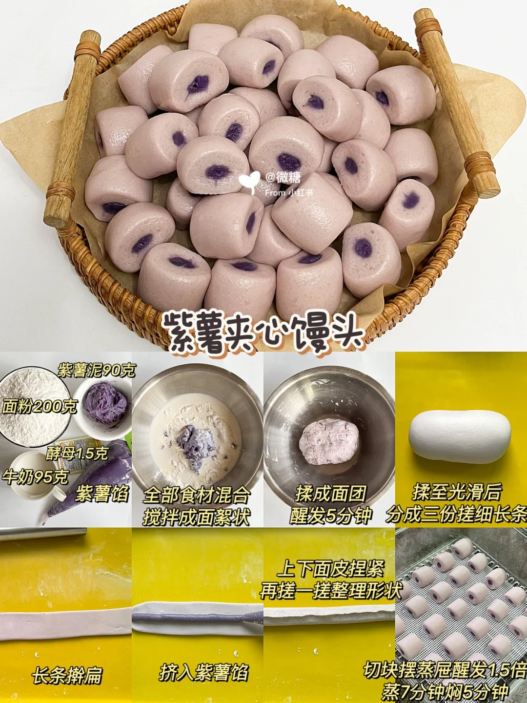 面粉200克,紫薯泥90克,牛奶95克,酵母1.5克