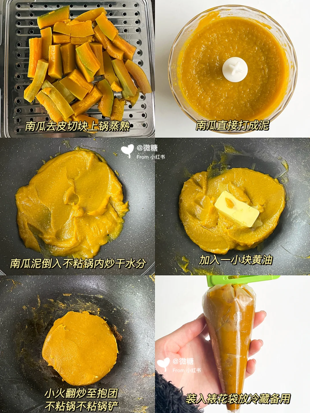 2️⃣南瓜泥倒入不粘锅,将水分炒干,再加入一小块黄油