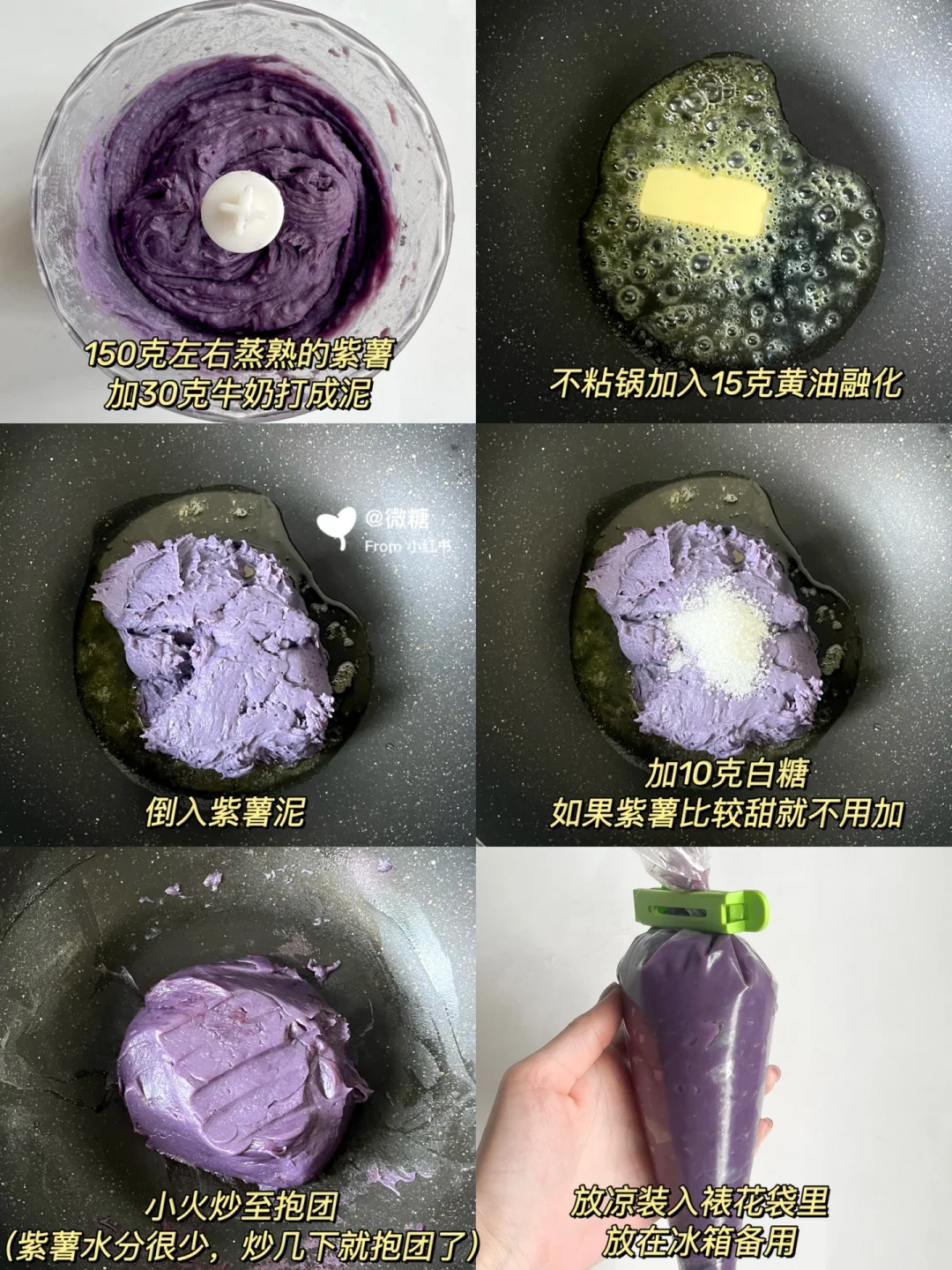2️⃣不粘锅下黄油融化,倒入紫薯泥,加点白糖或奶粉,小火炒至即可。放凉装裱花袋,放冰箱备用