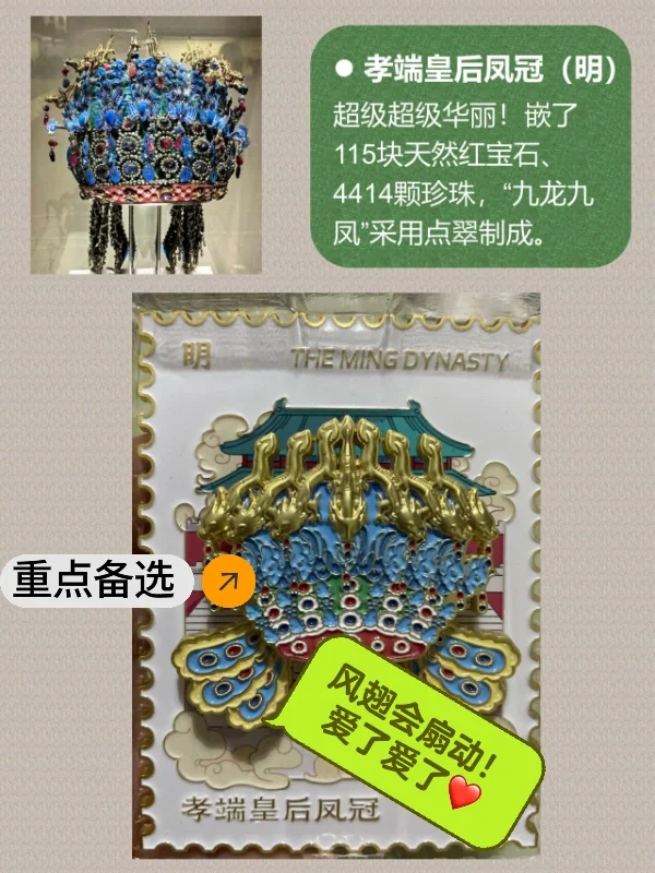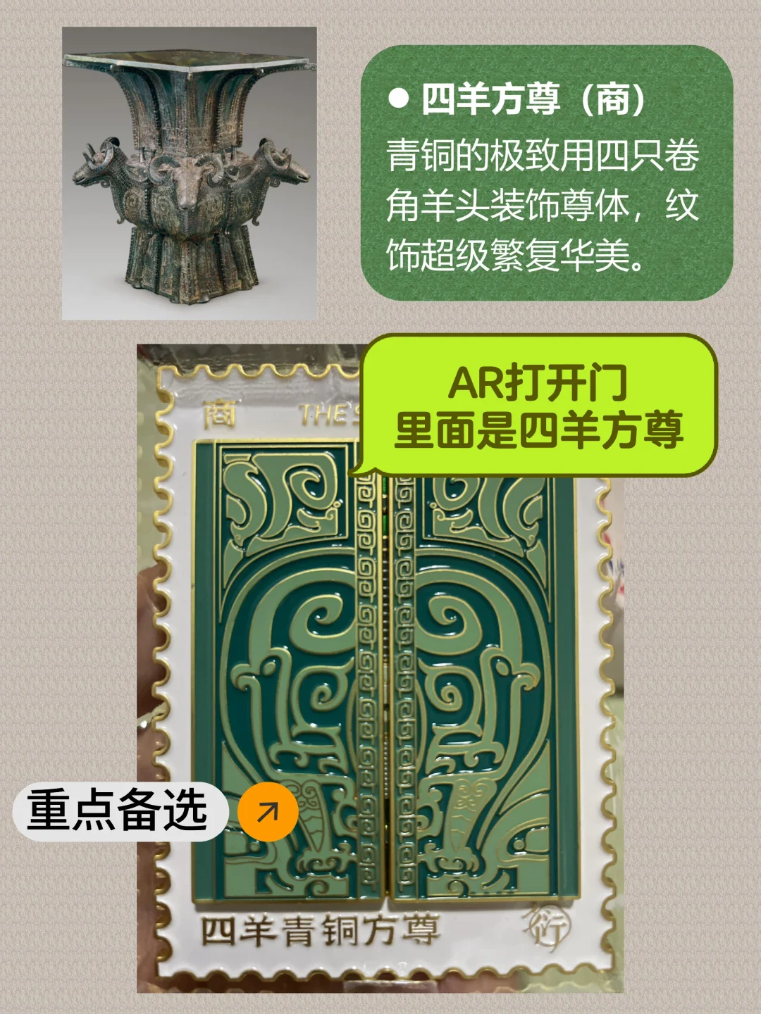 盘了一下,基本是每个年代选一件代表文物,感觉用大相框拼起来会超好看! 但是!据说现在只能在国博负一层买,而且每人限购3件[哭惹R][哭惹R] 这简直要逼死选择困难症! 强迫朋友都拍了照片,然后还给我弄了AR截屏。 ⚠️⚠️大家帮忙看看选哪个? [一R]红山玉龙(新石器):中华第一龙 墨绿色岫岩玉雕琢、C形玉龙,距今有5000余年,龙图腾崇拜的源头。 [种草R]冰箱贴:感觉比实物更萌,扫AR有石器时代的生活场景。 [二R]四羊方尊(商):青铜的极致 用四只卷角羊头装饰尊体,纹饰超级繁复华美。 [种草R]冰箱贴:看着像一扇青铜大门,扫AR“门”就开了,里面是拼接而成的四羊方尊——感觉这个AR效果最好[色色R][色色R] [三R]击鼓说唱俑(汉):市井的欢乐 东汉说唱艺人袒胸露腹、击鼓嬉笑,一看就让人超级开心。 [种草R]冰箱贴:笑得非常憨,还原度有80%。 [四R]三彩载乐骆驼俑(唐):丝路缩影 盛唐时期的三彩代表,骆驼的背上五位胡人乐俑演奏的是“胡部新声”——源自西凉,融合了龟兹、高昌音乐元素,流行于开元、天宝年间。 [种草R]冰箱贴:比较好玩是骆驼可以动,AR的丝路感还不错。 [五R]蹴鞠纹青铜镜(宋):男女混合踢足球 叙事主题的铜镜,男女四人分组、在庭院里蹴鞠——知道宋代蹴鞠流行,没想到还可以男女一起玩。 [种草R]冰箱贴:下面的“鞠”可以动 [六R]青花云龙纹罐(元):青花龙 龙身矫健,凶猛强悍,是典型的元代龙;类似的元青花今年5月在香港苏富拍出了2599.5万港币。 [种草R]冰箱贴:罐子里面有金粉,可以流动。 [七R]孝端皇后凤冠(明):美就完了 超级超级华丽!嵌了115块天然红宝石、4414颗珍珠,冠面上的“九龙九凤”采用点翠制成。 [种草R]冰箱贴:两边的凤翅还能晃动——这个感觉颜值最高! [八R]海晏河清尊(清):末世悲歌 景德镇御窑为圆明园烧制,海晏堂是圆明园最大的西洋宫殿,十二生肖兽首就安放在堂外的喷水池,可惜圆明园付之一炬、兽首四散…… [种草R]冰箱贴:可以打开,挺有趣的。 —— ❓❓选哪个 最动心是四羊方尊,喜欢玉龙和三彩骆驼的AR,但是凤冠太美了!然后海晏河清能打开!——所以到底保哪个[哭惹R][哭惹R] 话说,这套冰箱贴为啥只做8件、不做9件啊?长长久久不好吗?还是国博就那么想发[偷笑R][偷笑R]