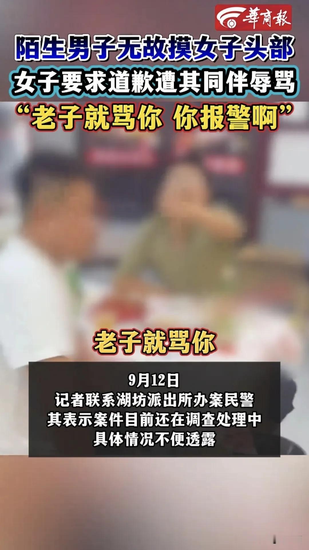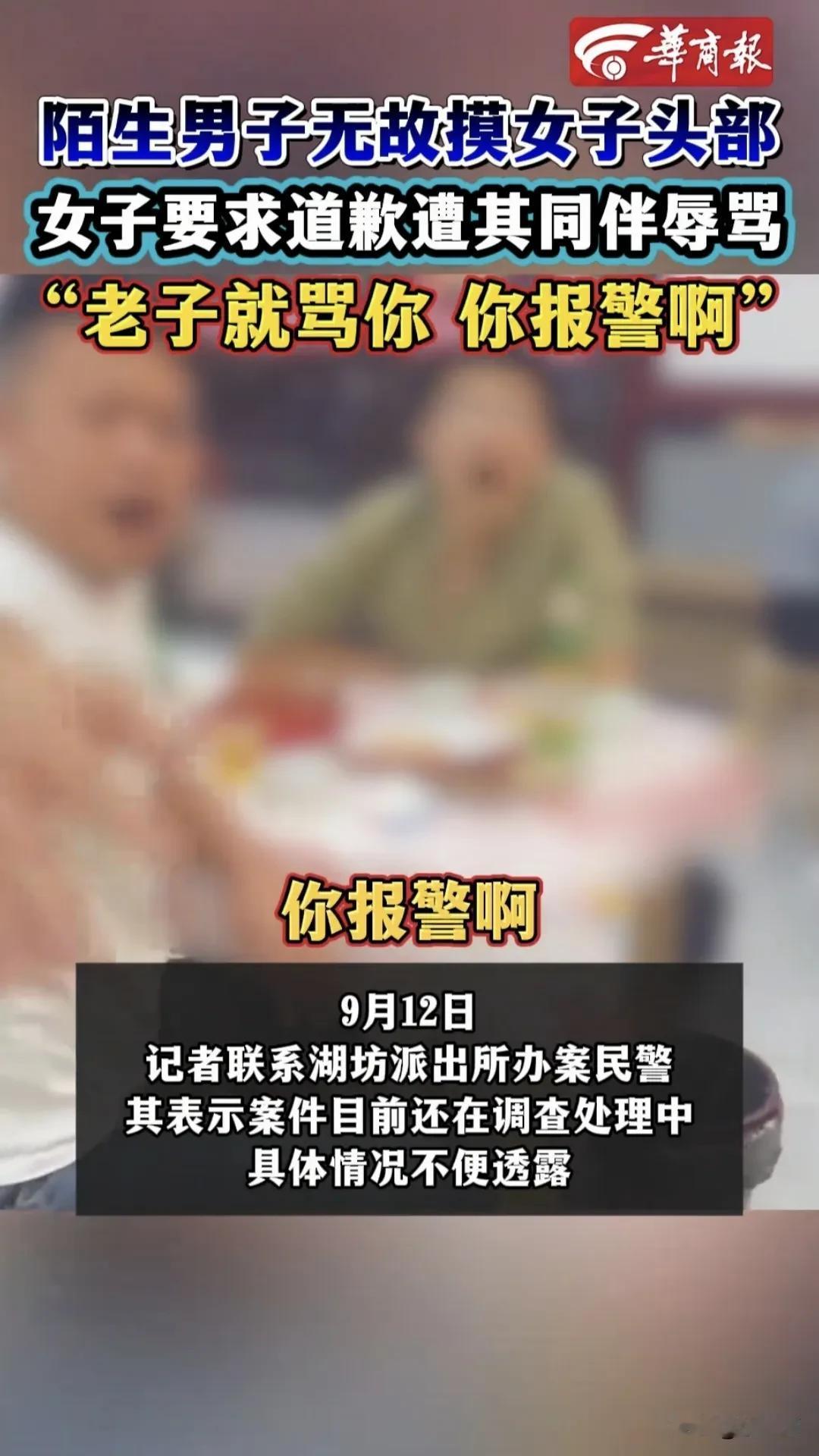 陌生男子在餐馆无故摸女子头部,女子要求道歉遭其同伴辱骂,甚至嚣张喊话“老子就骂你,你报警啊”。 处罚结果是无故摸女子头部的男子行政拘留,其同伴被罚款处理。 感觉还是处罚的稍微轻了一点,这种人心理肯定是有点问题的,不然怎么会在大庭广众之下做出这种行为,还不觉得这种行为是对别人的一种侵犯,甚至别人要求道歉还嚣张骂人,没有素质并且三观不正。 图源:华商报