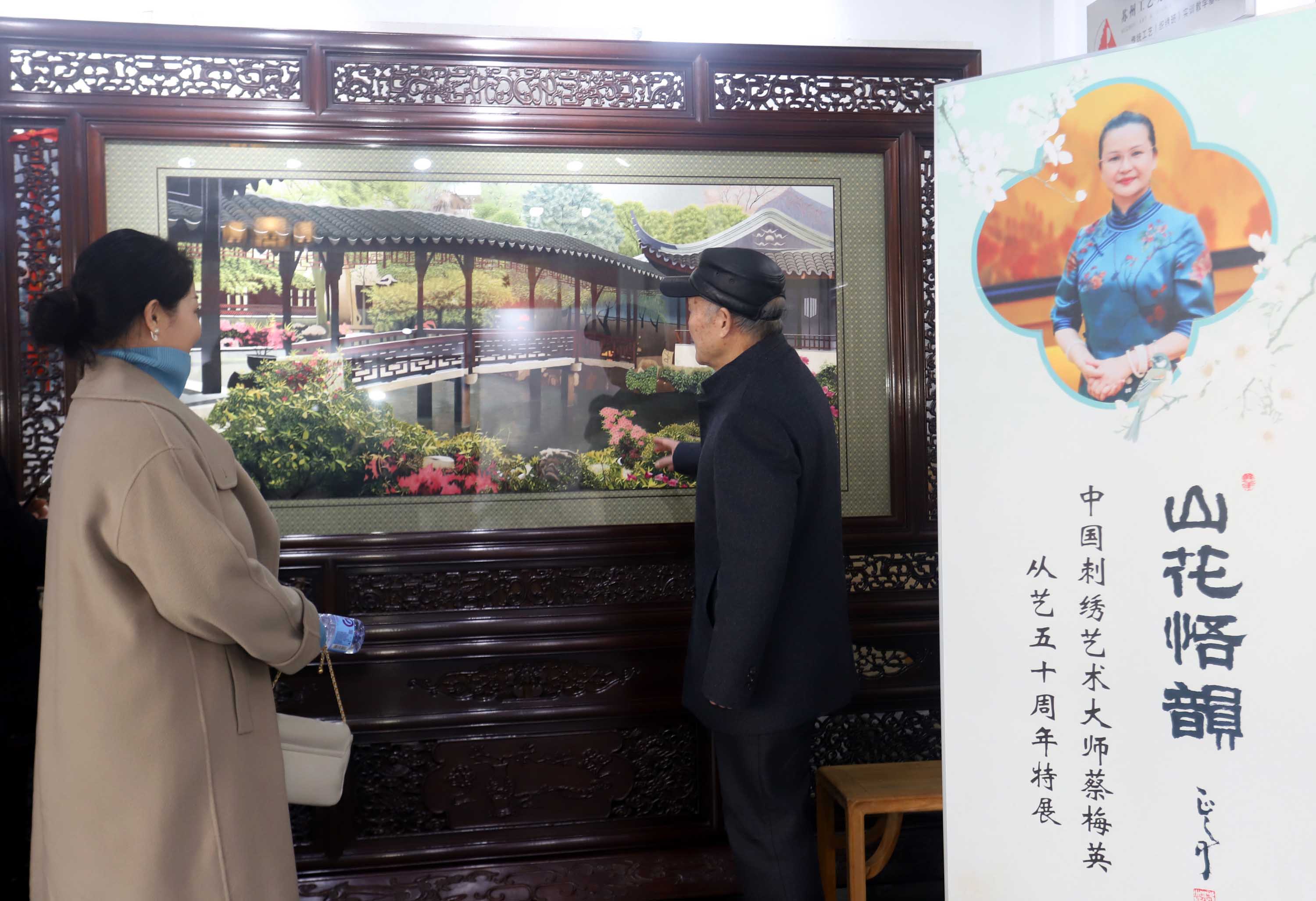 展厅内,刺绣精品错落陈列,山水作品层次分明,远峰含黛、近水漾波,尽显“远近之趣”;人物绣像眉眼灵动,神态鲜活,仿佛能窥见人物内心的情绪;花鸟作品则姿态绰约,翎羽的纹理、花瓣的脉络皆被针线勾勒得栩栩如生。这些作品不仅展现了苏绣技艺精髓,更凝结着蔡梅英半个世纪的艺术积淀。