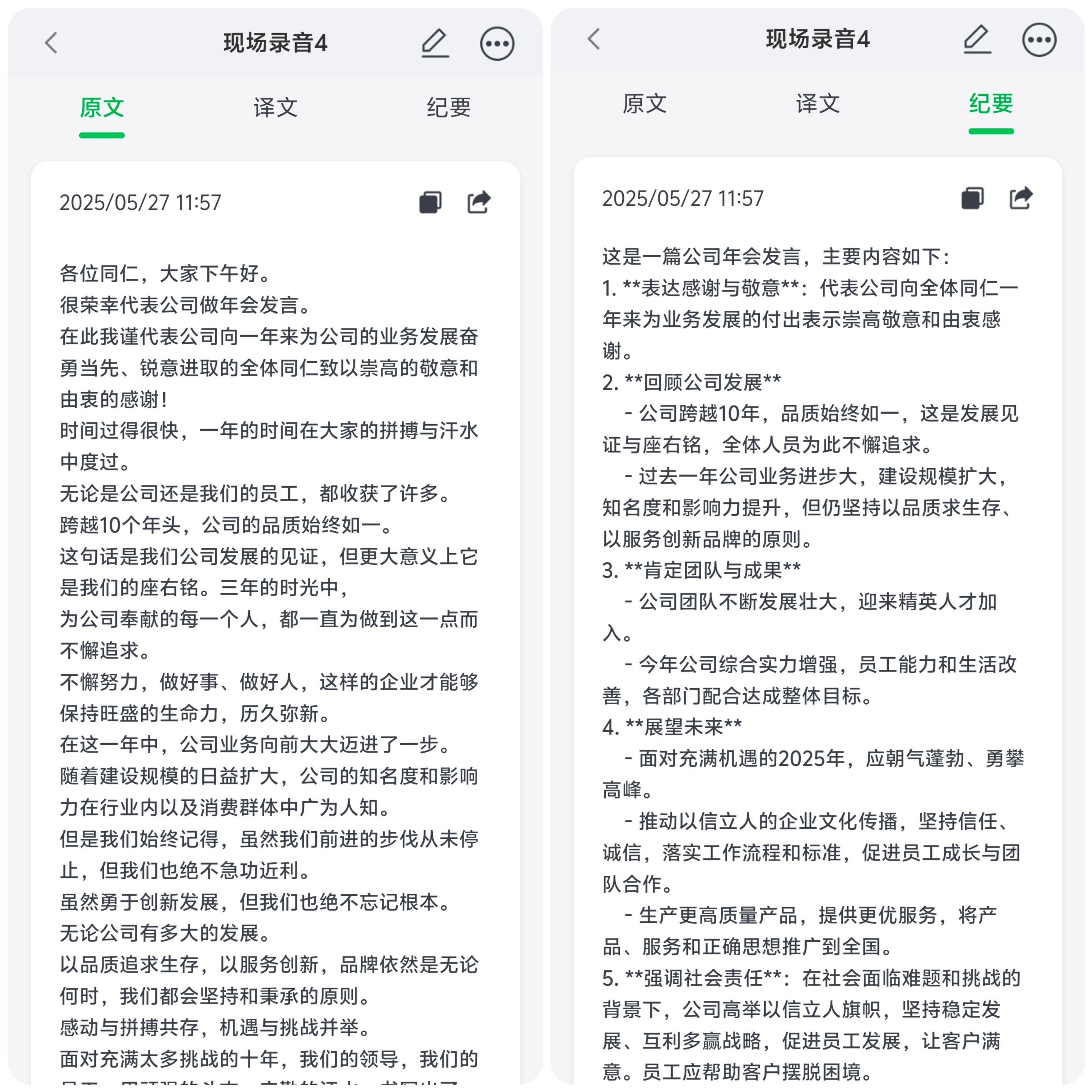 它可以通过录音直接转写领导的发言,方便你在会后重新“理解会议精神”;如果感觉又臭又长懒得看,那还可以让AI自动提取关键词,生成摸鱼版的会议纪要,将十几分钟的废话硬是浓缩成几百个字,咱不说完全“理解会议精神”,应付专员抽查绝对绰绰有余!
