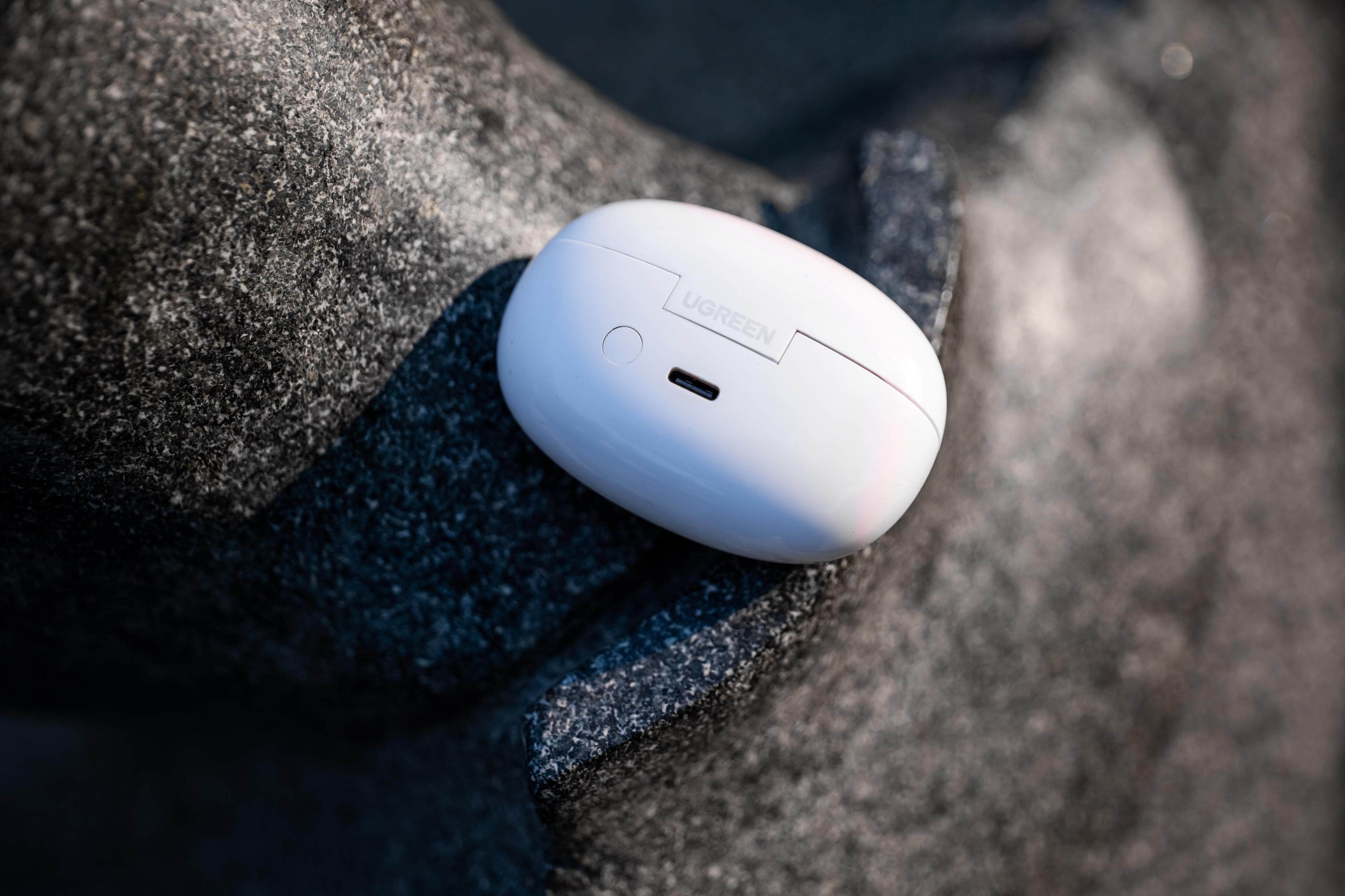 Type-C口、配对按键以及品牌LOGO集中在电池仓背面。由于绿联LOGO字体偏浅灰,且配对按键无装饰,因此哪怕内容非常集中,却依旧不会给人带来繁杂感。