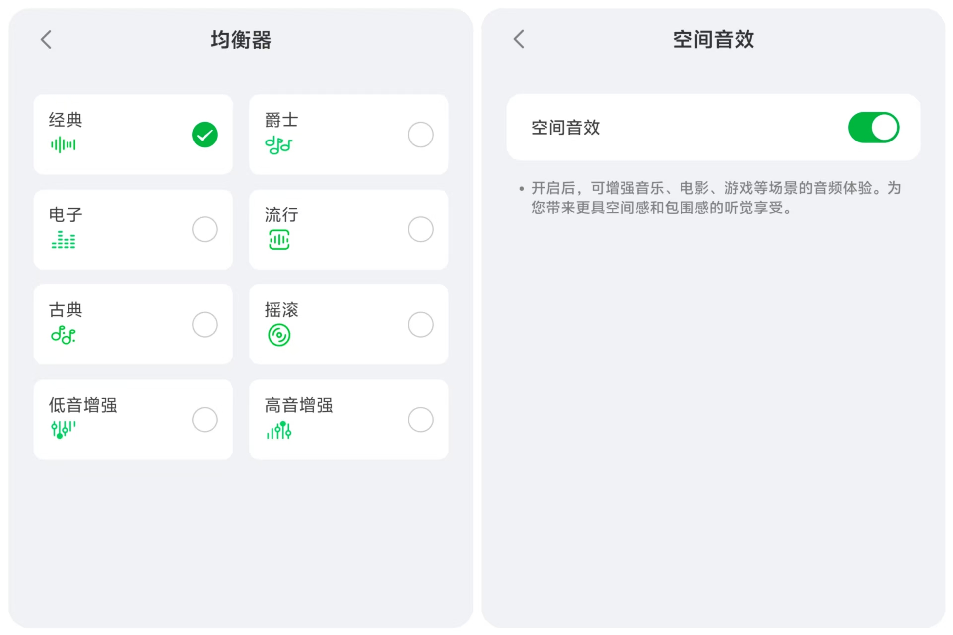 有一说一,绿联默认的经典音质调校已经足以应付绝大多数使用场景。但如果大佬对声音细节要求更高,还可通过配套的绿联APP进行细节调整——8种EQ模式精准适配不同音乐风格,空间音效可有效扩展声场的立体感,带来更强的听觉享受。