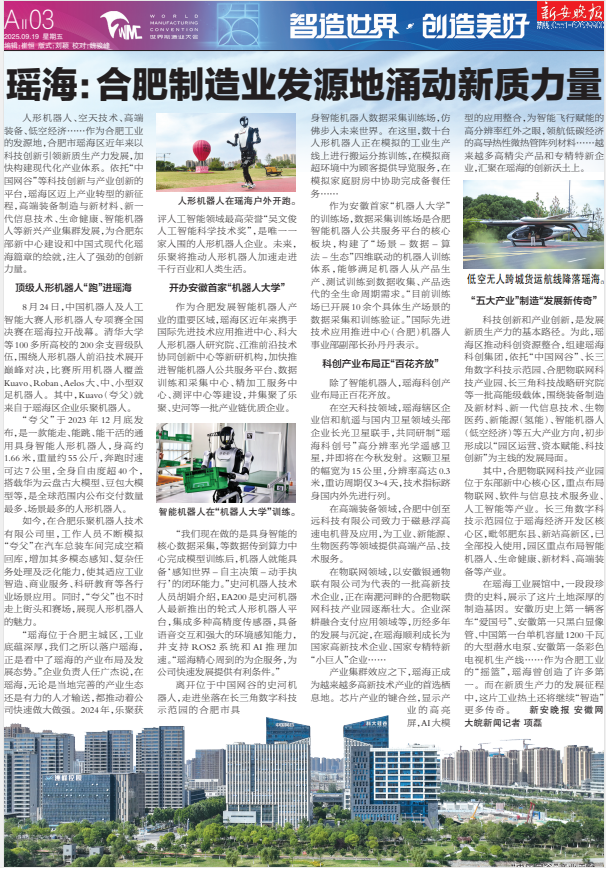 人形机器人、空天技术、高端装备、低空经济……作为合肥工业的发源地,合肥市瑶海区近年来以科技创新引领新质生产力发展,加快构建现代化产业体系。依托“中国网谷”等科技创新与产业创新的平台,瑶海区迈上产业转型的新征程,高端装备制造与新材料、新一代信息技术、生命健康、智能机器人等新兴产业集群发展,为合肥东部新中心建设和中国式现代化瑶海篇章的绘就,注入了强劲的创新力量。