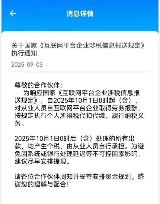近年来,"拉卡拉提现代扣税"、"微信支付提现收费"、"支付宝商家码扣税"等话题在社会上广泛流传,引发了公众对支付成本上升和现金回归的担忧。部分讨论将支付平台的合规操作误解为对个人财富的直接征税,造成了不必要的恐慌。2025年9月,拉卡拉支付有限公司发布《关于国家〈互联网平台企业涉税信息报送规定〉执行通知》,宣布自2025年10月1日0时起(含)对从业人员自互联网平台企业取得劳务报酬按规定执行个人所得税代扣代缴,履行纳税义务**。这一新政标志着支付行业税务合规进入新阶段。