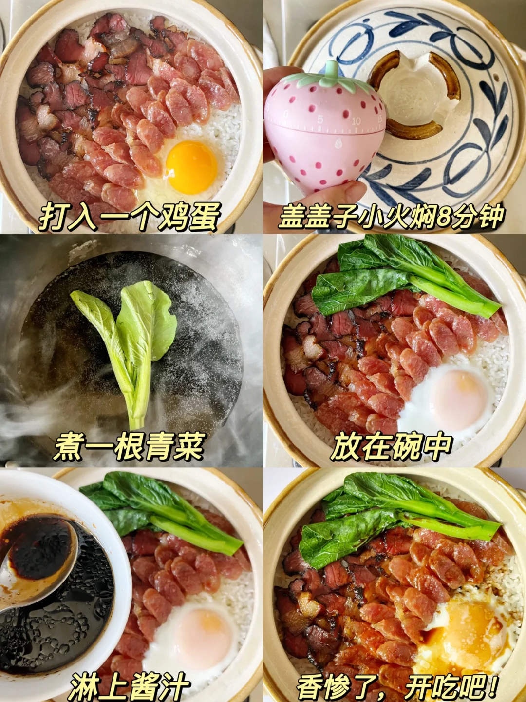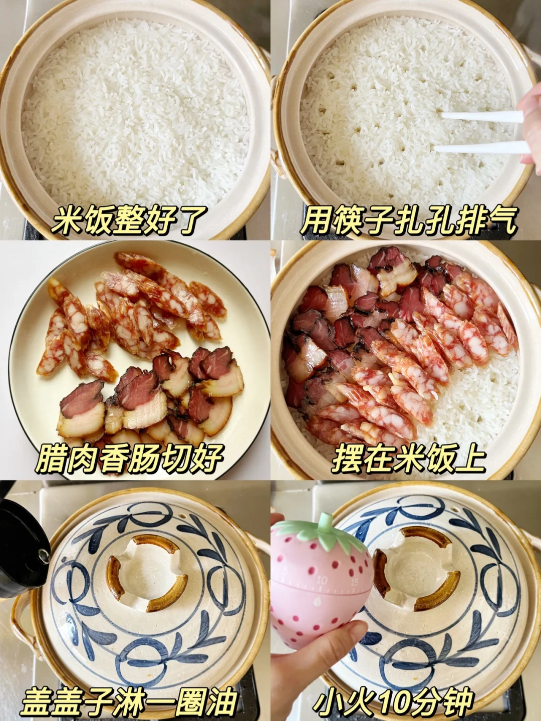 5️⃣到时间了关火,米饭用筷子在米饭上扎孔排气,把香肠和腊肉摆好