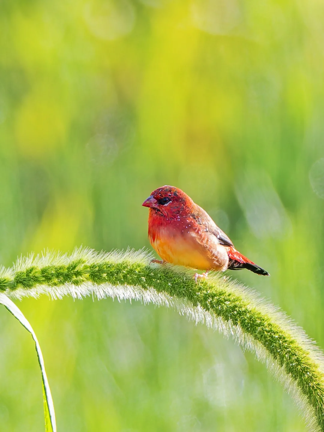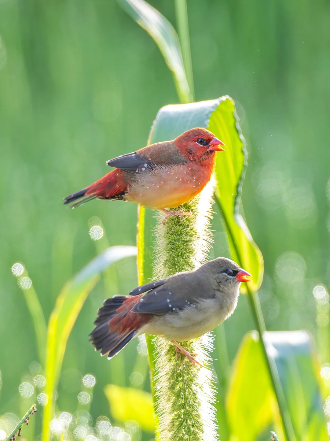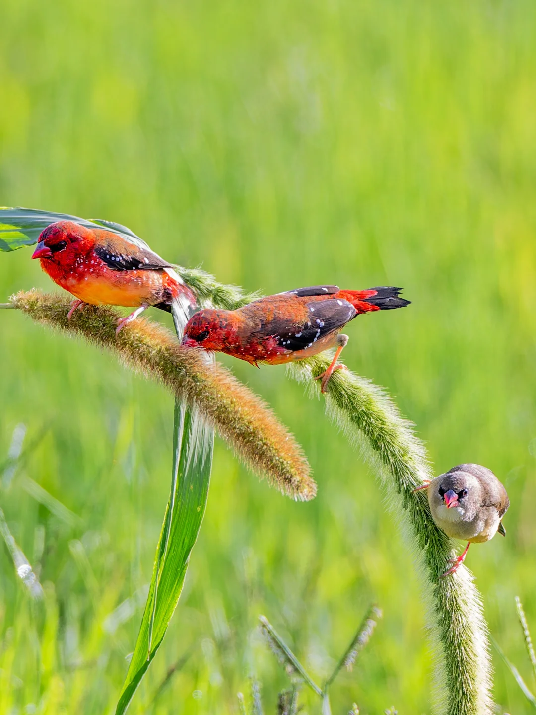 原创拍摄于2025.07 红梅花雀,Red Avadavat,雀形目梅花雀科红梅花雀属。注意这个名字的短句哈哈,是“红·梅花雀”,不是“红梅·花雀”,因为它就是一种梅花雀。红梅花雀是一种典型的南亚东南亚鸟种,在我国是边缘分布,只在云南和海南有一些种群。 红梅花雀形态美丽,雄鸟红色,点缀着小白点,犹如珍珠般璀璨,也特别像草莓🍓。雌鸟灰褐色,臀部和尾上覆羽带红色。 每年夏季6-9月正是在云南观赏这种美丽小草莓🍓的最佳时机啦。